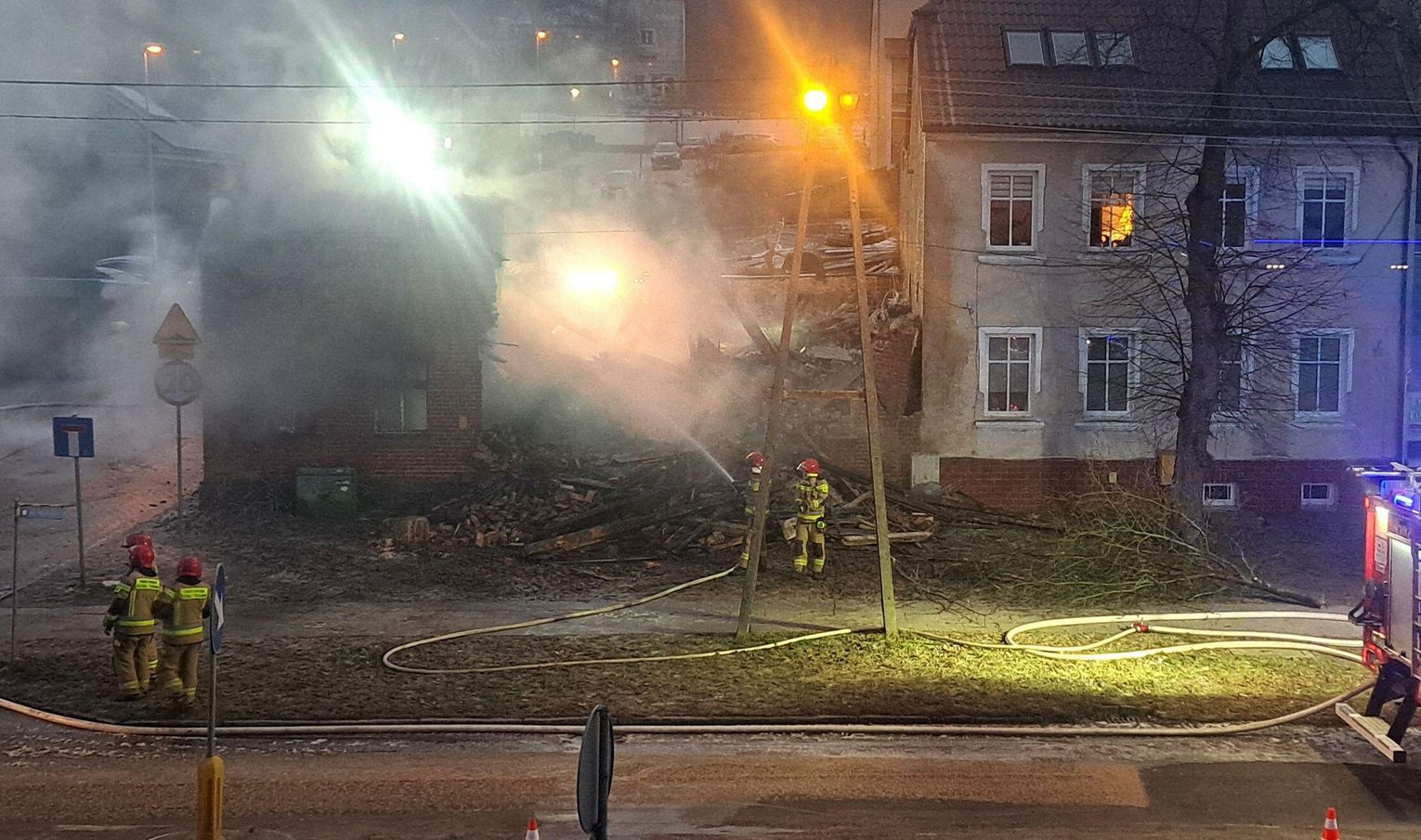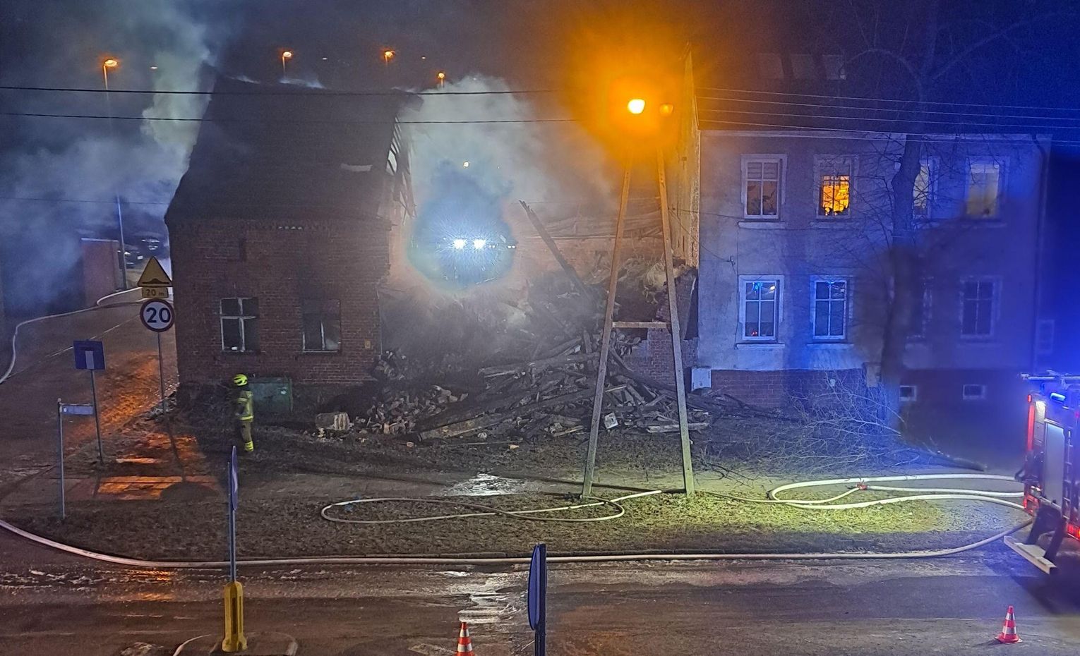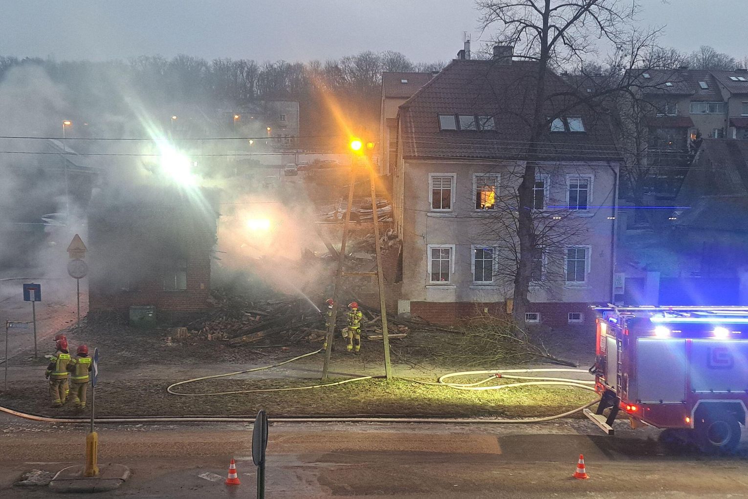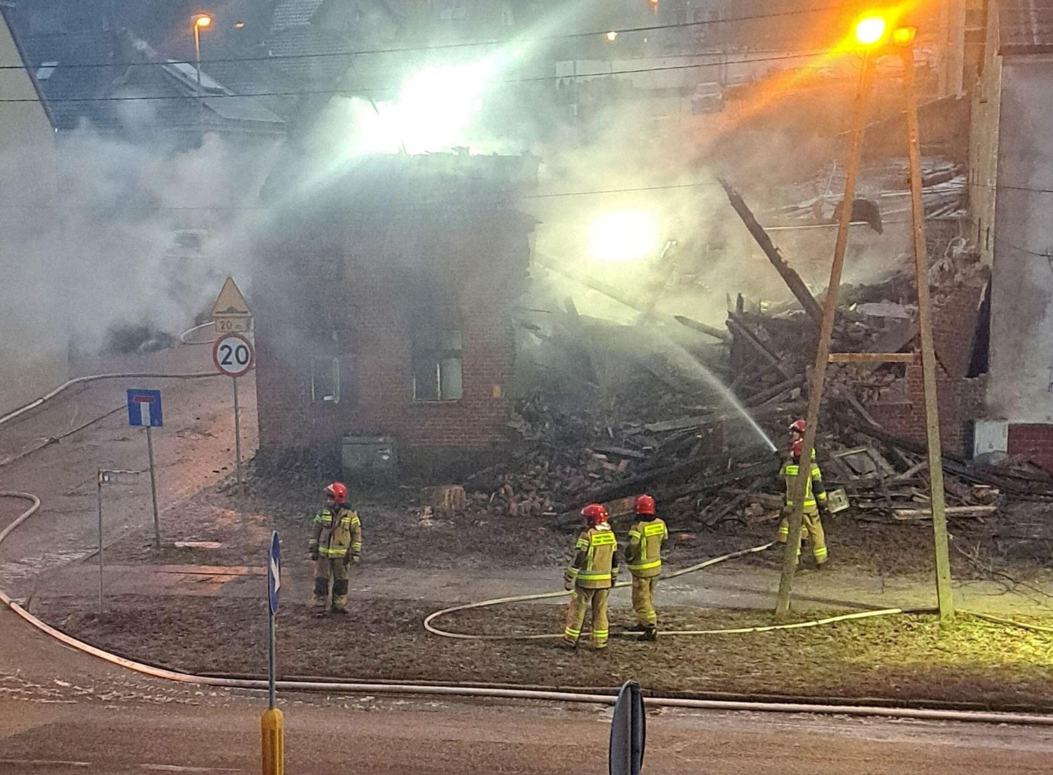 Dzięki bliskości Komendy Powiatowej Państwowej Straży Pożarnej, która mieści się przy tej samej ulicy, pierwsze zastępy pojawiły się na miejscu w ciągu zaledwie kilku minut. Strażacy musieli działać pod ogromną presją, by zapobiec przeniesieniu się ognia na sąsiednie posesje. Choć jest już ranek, na miejscu wciąż pracują liczne ekipy, dogaszając pogorzelisko i zabezpieczając konstrukcję.
