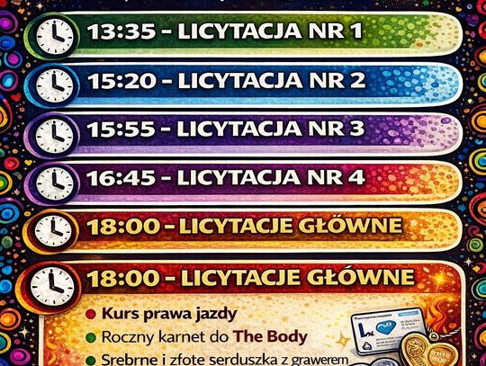 - 16:45 (Blok 4): Spacer po podziemiach Urzędu Wojewódzkiego, godzinny przejazd luksusową limuzyną (wartość 450 zł), treningi personalne i pole dance oraz usługi zegarmistrzowskie u Roberta Jankowskiego.