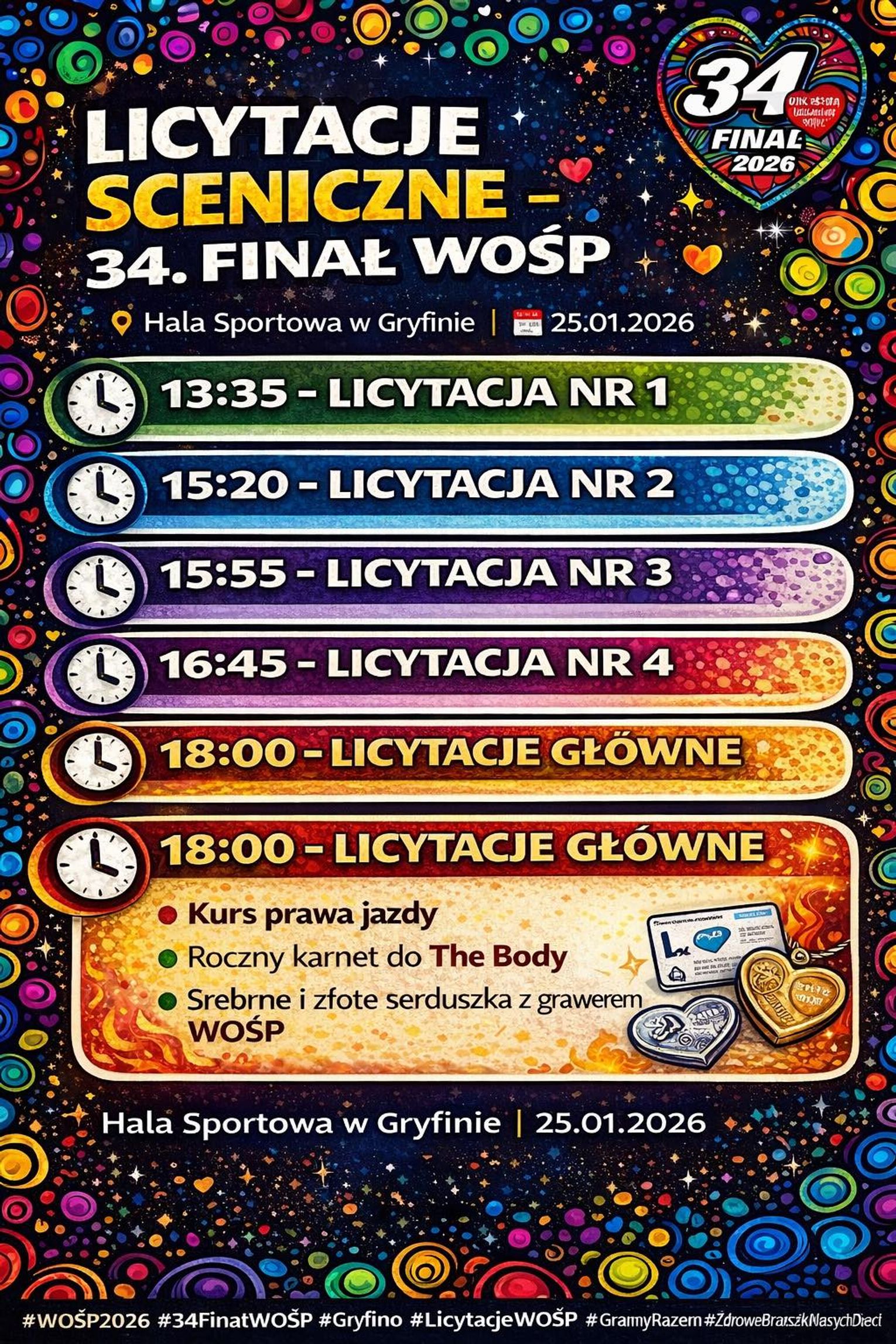 - 13:35 (Blok 1): Zestawy WOŚP i Gminy Gryfino, voucher do Mapi Gaju, biografia Jana Borysewicza z autografem, zajęcia z robotyki oraz dzień w Stajni Zacisze.