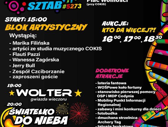 - Dla każdego: fotobudka, loteria fantowa oraz WOŚPowe koło fortuny.