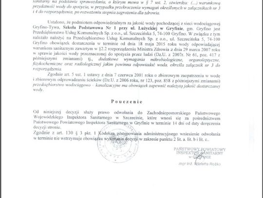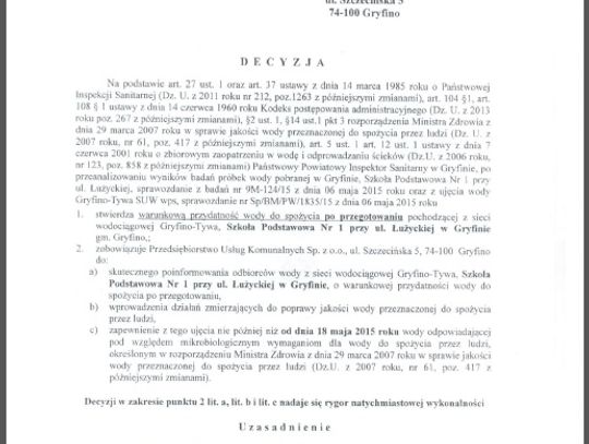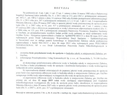Burmistrz Miasta i Gminy Gryfino informuje, że woda z sieci wodociągowej na terenie gminy Gryfino jest zdatna do spożycia. W związku z bieżącym monitorowaniem ujęć i sieci wodociągowej przeprowadzane są stałe badania wody. Na ich podstawie stwierdzono dwa przekroczenia norm sanitarnych w obiektach gminnych: w Szkole Podstawowej nr 1 w Gryfinie przy ul. Łużyckiej i Szkole Podstawowej w Żabnicy. Na podstawie wydanych decyzji przez powiatowego państwowego inspektora sanitarnego w Szkole Podstawowej nr 1 wodę można spożywać po przegotowaniu. Do Szkoły Podstawowej w Żabnicy woda będzie dostarczana beczkowozem.