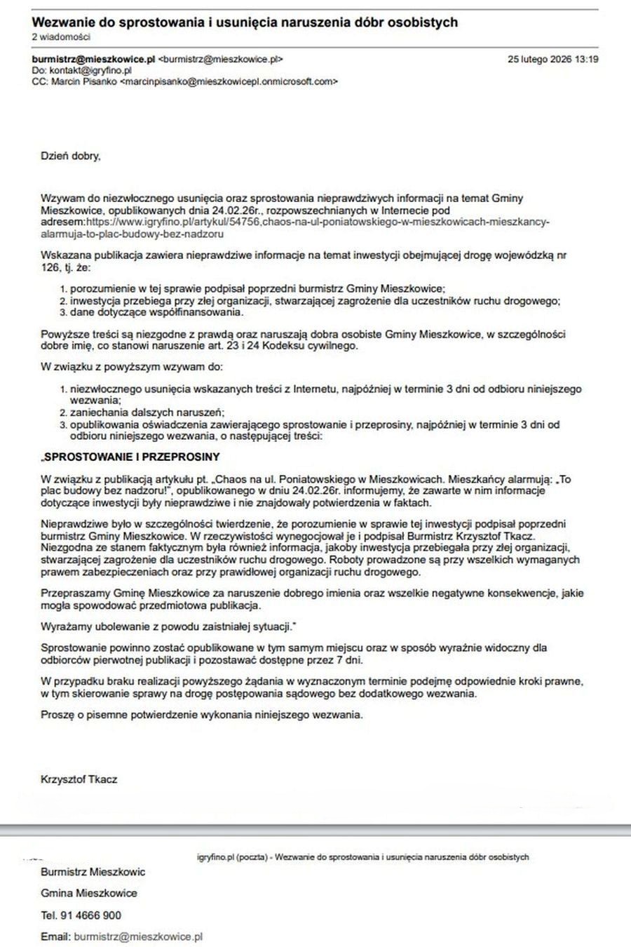 W związku z artykułem pt. „Chaos na ul. Poniatowskiego w Mieszkowicach...”, opublikowanym w dniu 24.02.2026 r., prostujemy podane informacje: