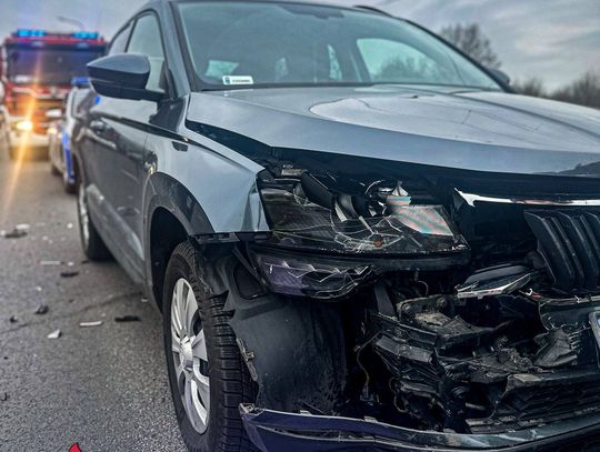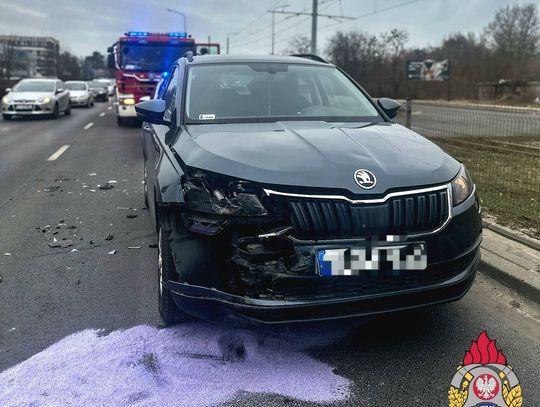 Siła uderzenia była na tyle duża, że oba samochody doznały poważnych uszkodzeń przodu i zostały obrócone na jezdni, blokując pas ruchu. Na zdjęciach wyraźnie widać roztrzaskane reflektory, zniszczone maski oraz płyny eksploatacyjne, które wyciekły na asfalt i zostały zabezpieczone przez strażaków specjalnym sorbentem (charakterystyczna fioletowa plama pod Skodą).