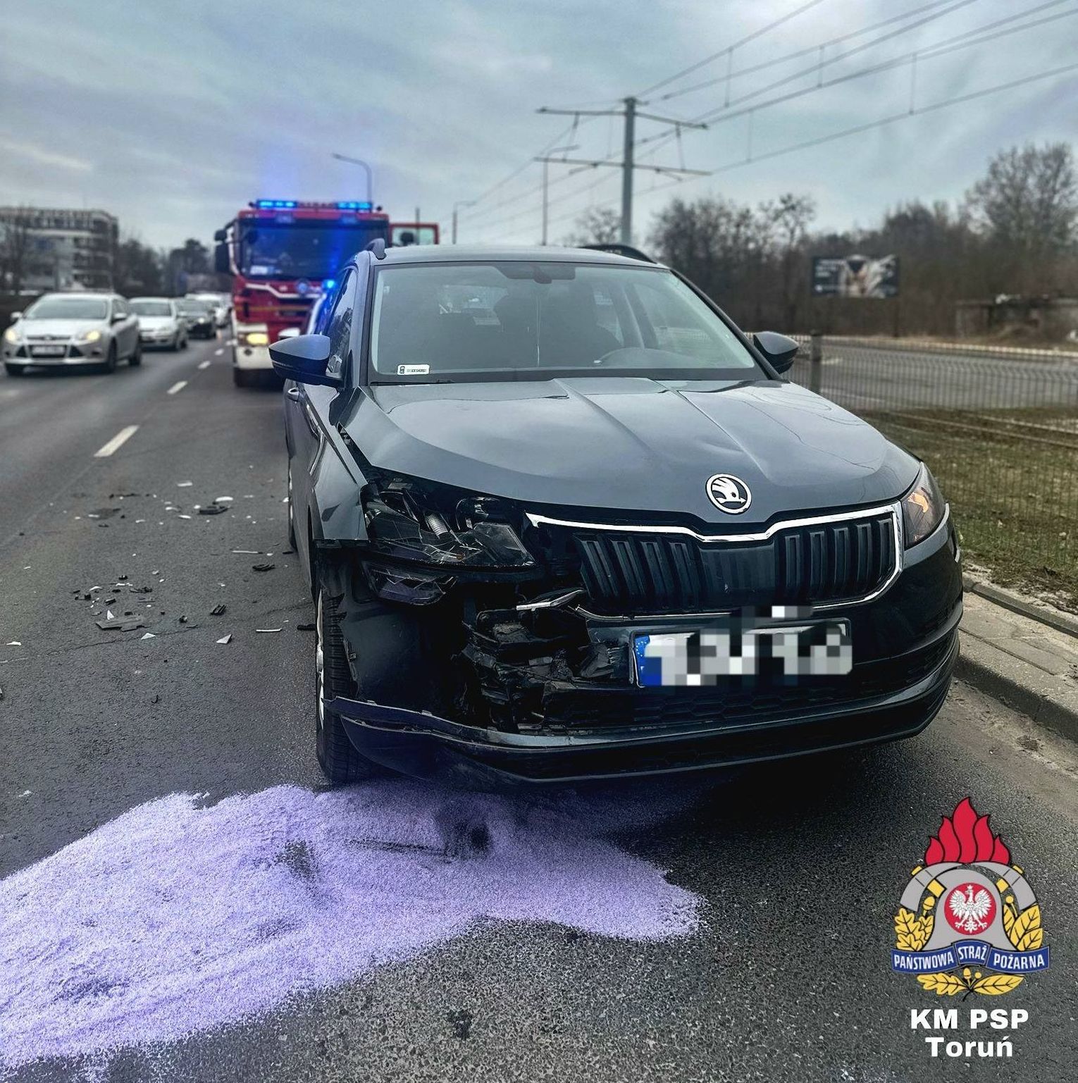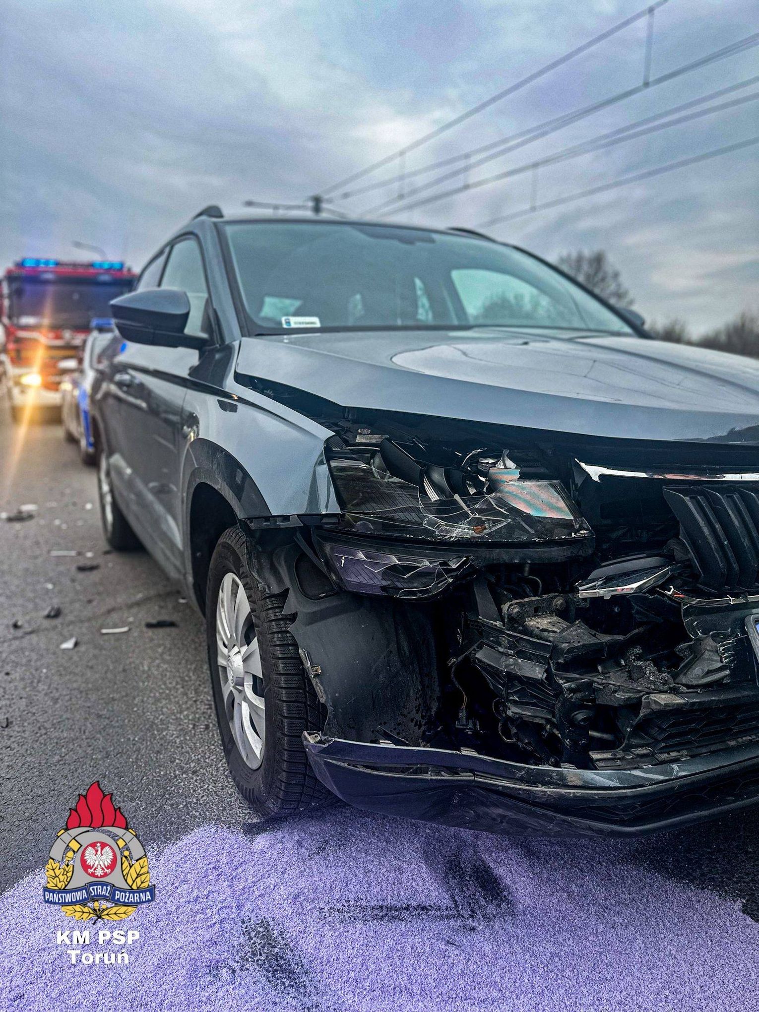 Na miejscu natychmiast zjawił się zastęp Państwowej Straży Pożarnej z JRG nr 1 w Toruniu. Strażacy zabezpieczyli teren i usunęli pozostałości karoserii z jezdni. Choć widok rozbitych aut wyglądał groźnie, tym razem dopisało szczęście.