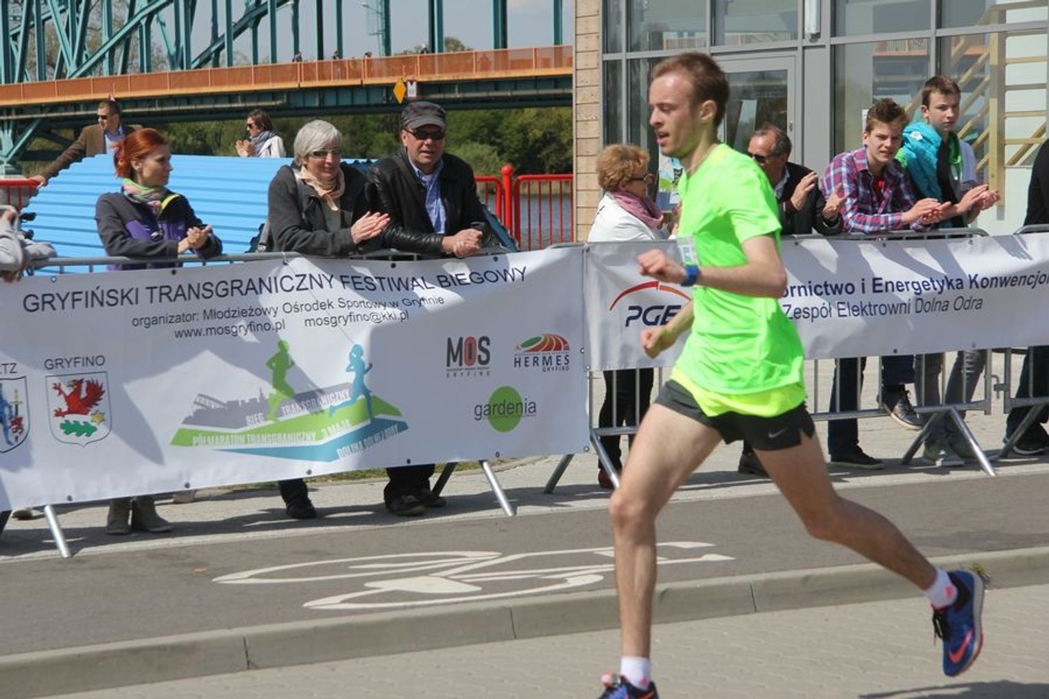 Podczas dzisiejszego biegu na 10 km w Gryfinie pierwszy na metę przybiegł Radosław Helon z MKS Szczecin. Znacznie wyprzedził drugiego na mecie Marka Saneckiego z Gryfina. Na trzecim miejscu uplasował się Rafał Wilk. Zapraszamy do fotorelacji z biegu.
