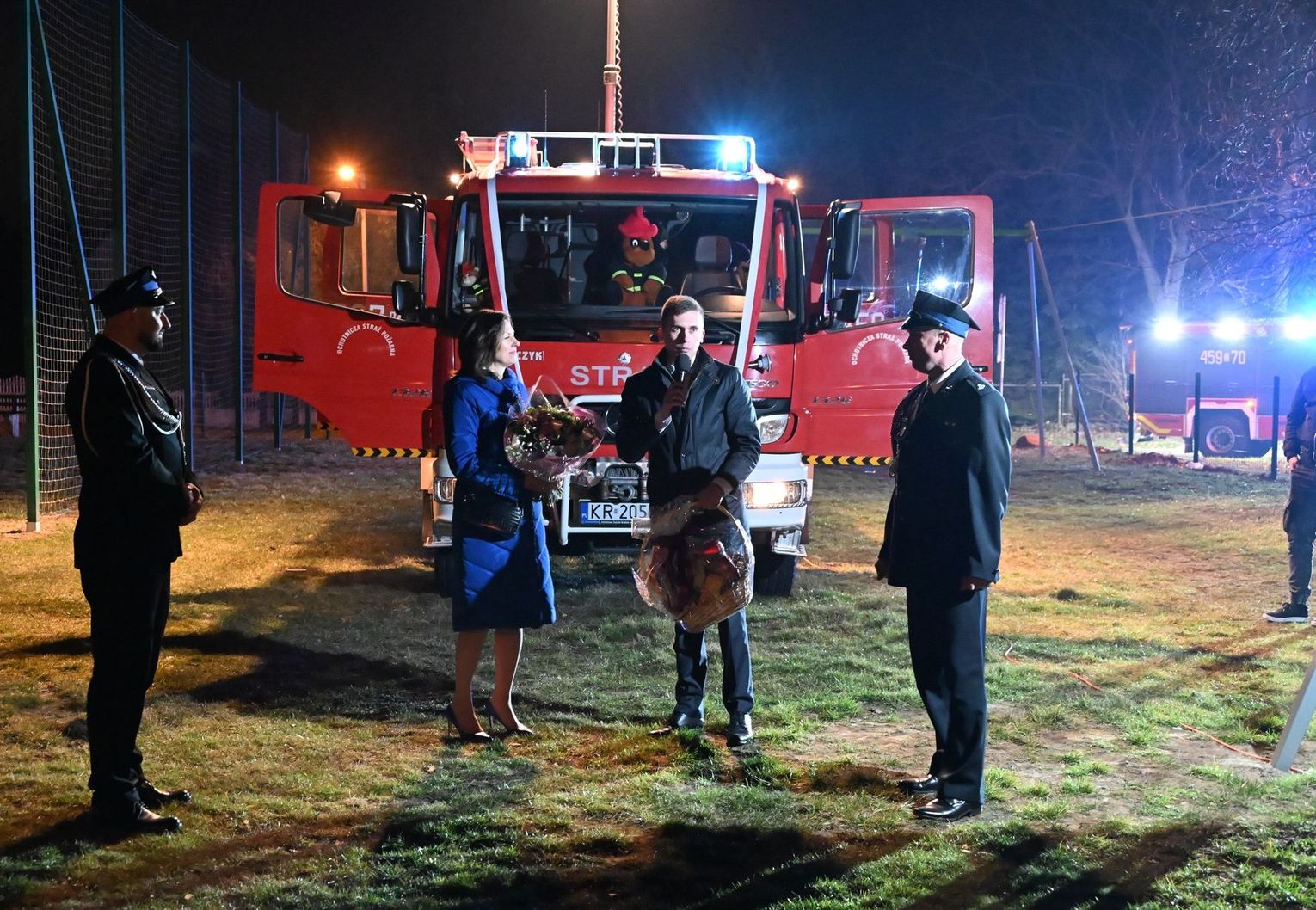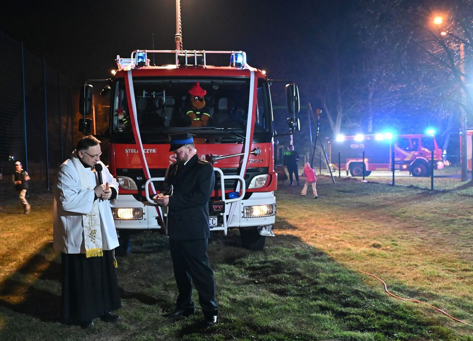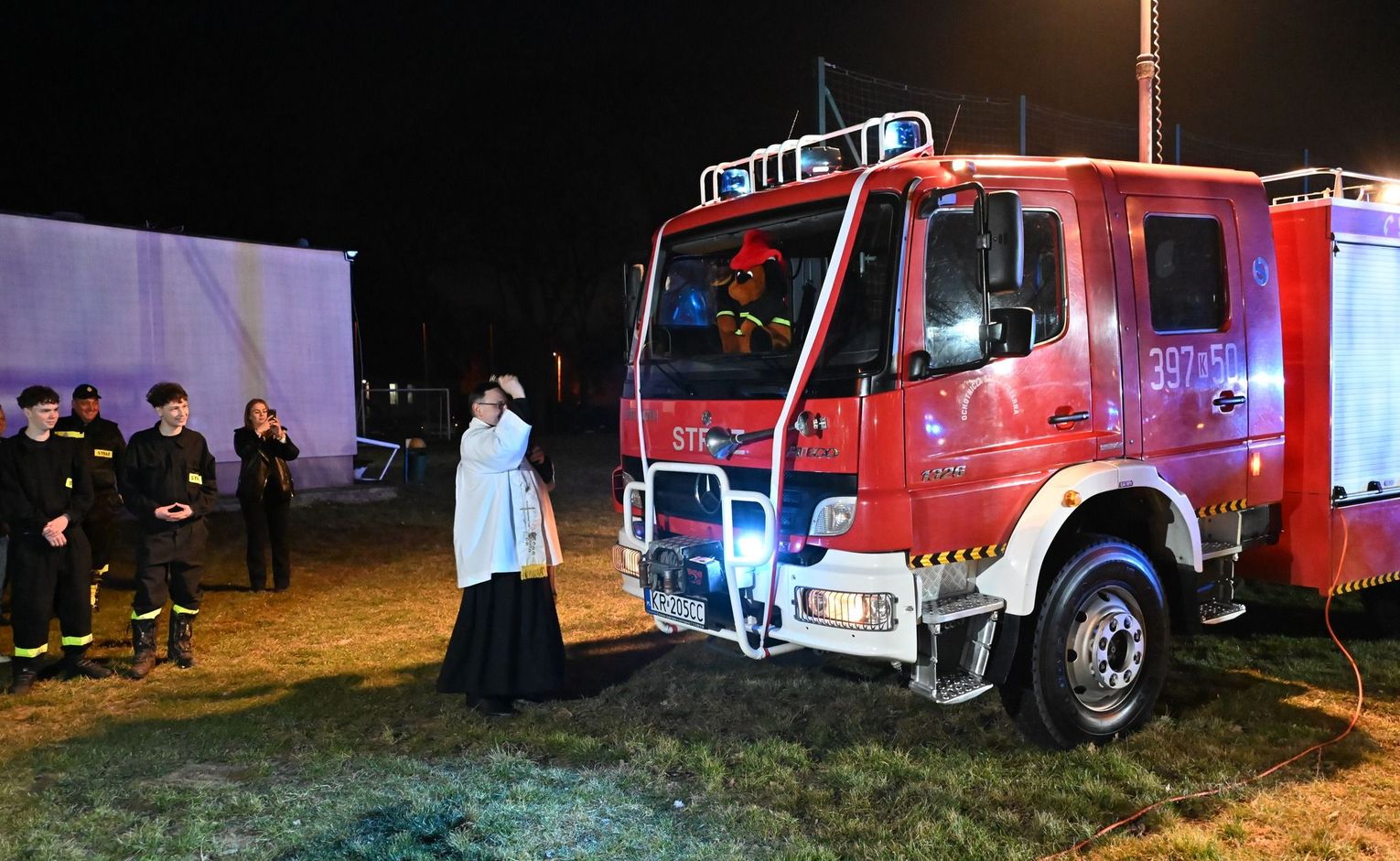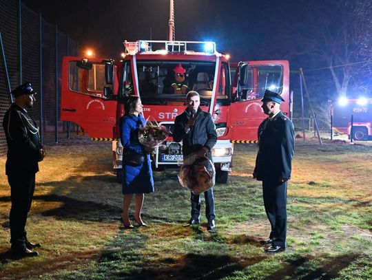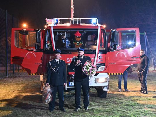 Nowy wóz został poświęcony przez ks. proboszcza Przemysława Pokorskiego, który przekazał kierowcy, dh. Jakubowi Skrzypie, medalik ze św. Krzysztofem. Obecny na miejscu wójt gminy Bartosz Biegus podkreślił, że radni jednogłośnie poparli zmiany w budżecie, by ta inwestycja stała się możliwa. Podziękowania popłynęły również do dh. Arkadiusza Baranowskiego, który mocno zabiegał o realizację tego przedsięwzięcia.