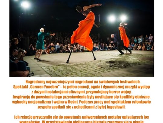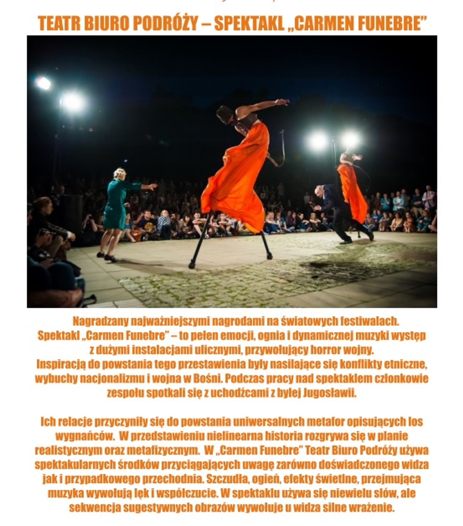 Jeden z najbardziej znanych i najciekawszych teatrów alternatywnych w Polsce. Zespół jest laureatem wielu prestiżowych nagród. Spektakl „Carmen Funebre” to pełen emocji, ognia i dynamicznej muzyki występ z dużymi instalacjami ulicznymi, przywołujący horror wojny. Inspiracją do powstania przedstawienia były nasilające się konflikty etniczne, wybuchy nacjonalizmu i wojna w Bośni. W „Carmen Funebre” Teatr Biuro Podróży używa spektakularnych środków przyciągających uwagę zarówno doświadczonego widza jak i przypadkowego przechodnia. Szczudła, ogień, efekty świetlne, przejmująca muzyka wywołują lęk i współczucie. W spektaklu używa się niewielu słów, ale sekwencja sugestywnych obrazów wywołuje u widza silne wrażenie.
