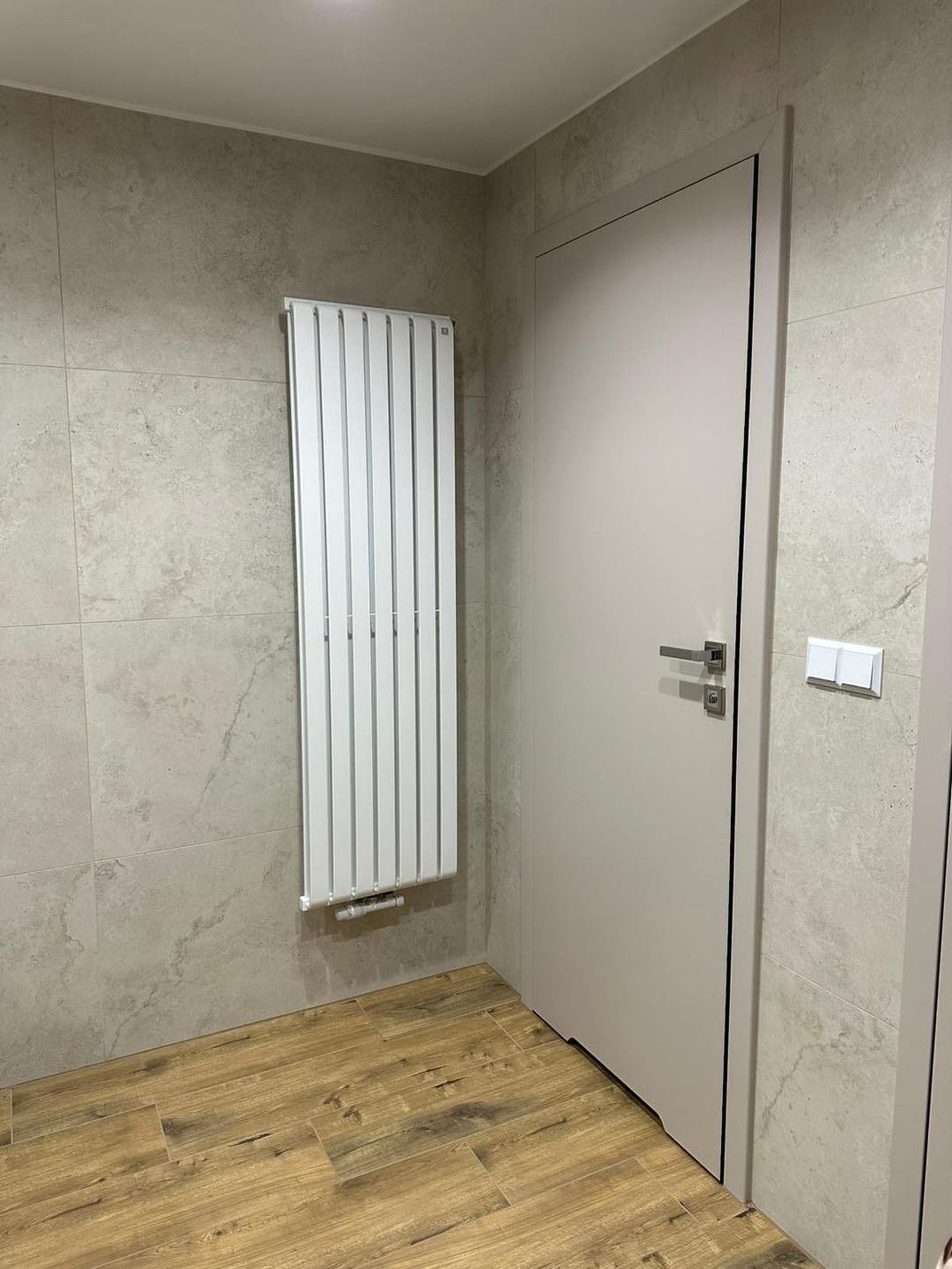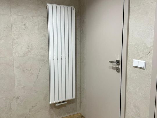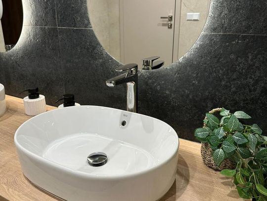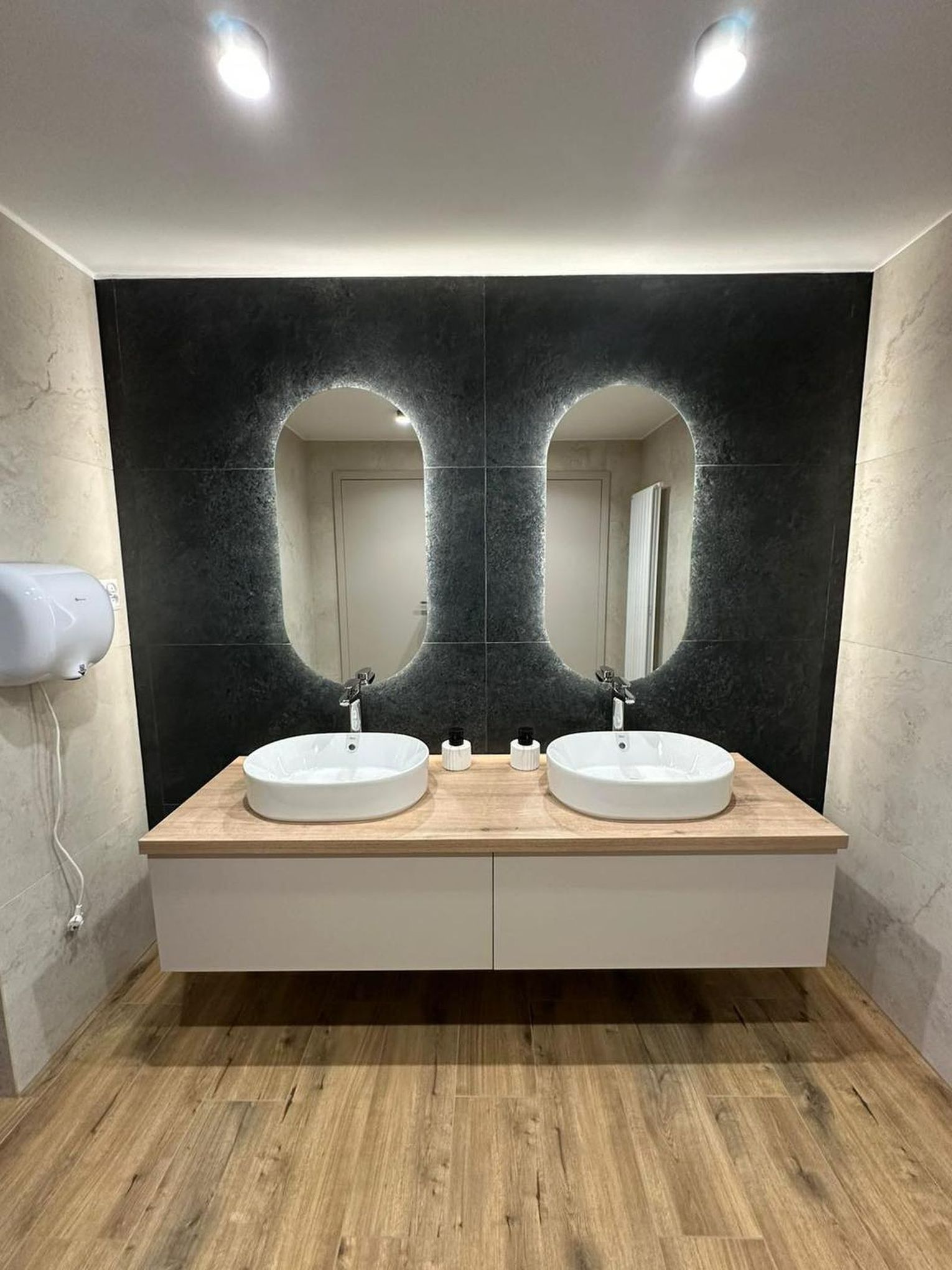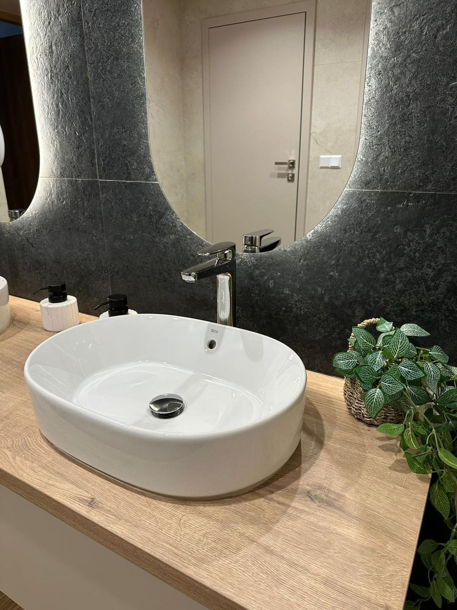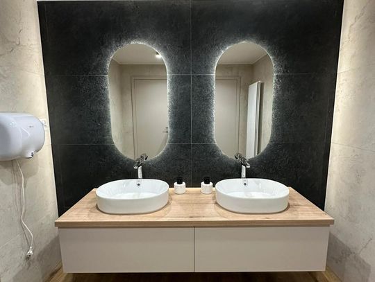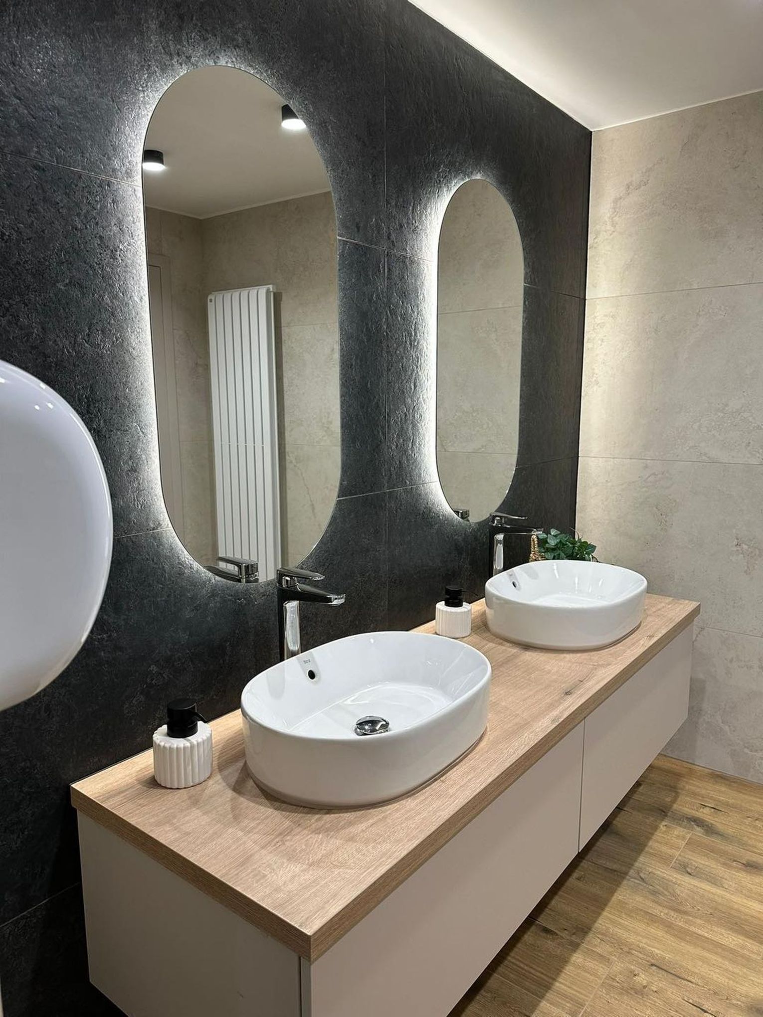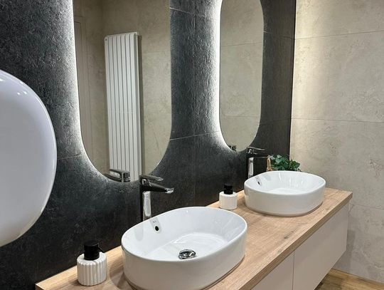 Największe wrażenie robią jednak detale: owalne, podświetlane lustra umieszczone na tle ciemnej ściany oraz eleganckie nablatowe umywalki. Całość dopełniają nowoczesne grzejniki i minimalistyczne oświetlenie, które nadaje przestrzeni intymnego, luksusowego charakteru.