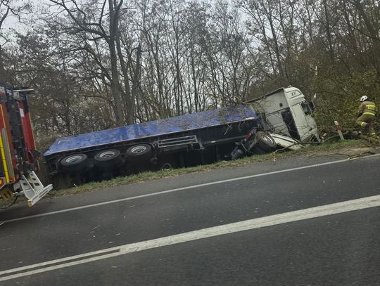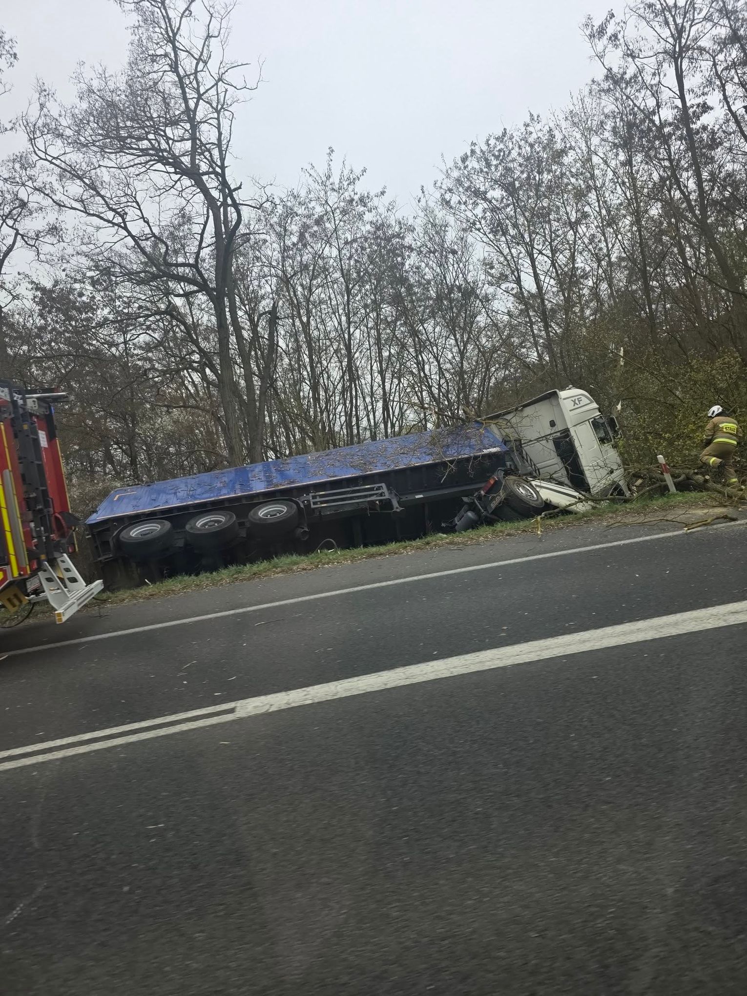 Około godziny 10:35 służby ratunkowe otrzymały dramatyczne zgłoszenie o pojeździe ciężarowym, który wypadł z trasy. Jak widać na opublikowanym zdjęciu, potężny zestaw (ciągnik siodłowy z naczepą-wywrotką) zjechał z jezdni, przerwał barierę energochłonną i z ogromną siłą wbił się w przydrożne zarośla oraz drzewa, przewracając się przy tym na prawy bok. Na fotografii widać również pracujących na miejscu strażaków oraz fragment wozu bojowego, co świadczy o skali prowadzonych działań ratunkowych.