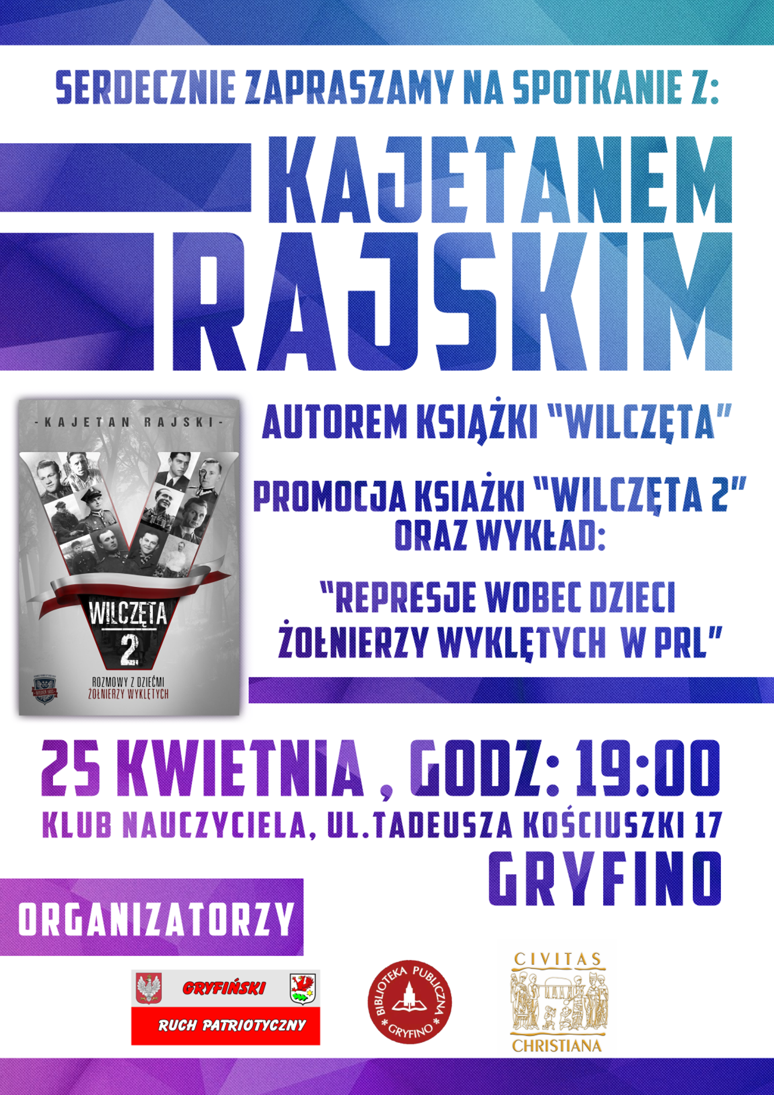 W ramach spotkania Kajetan Rajski wygłosi również wykład pt."Represje wobec dzieci Żołnierzy Wyklętych w PRL". Organizatorami spotkania są: Civitas Christiana, Biblioteka Miejska w Gryfinie oraz Gryfiński Ruch Patriotyczny.