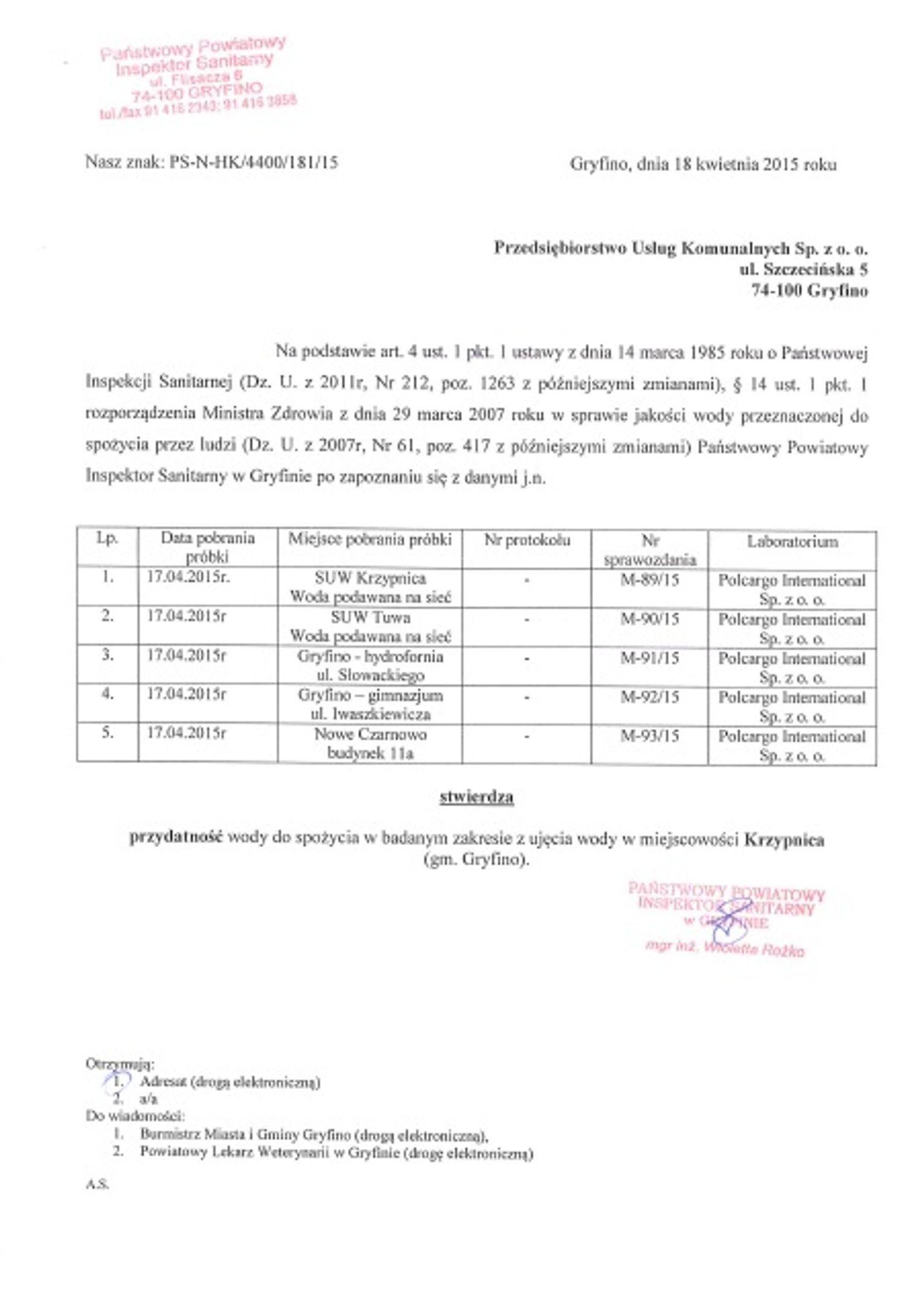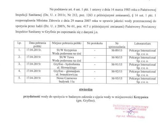 W dniu dzisiejszym Inspekcja Sanitarna wydała dokument (w załączeniu), w którym stwierdza przydatność wody do spożycia z ujęcia w Krzypnicy.