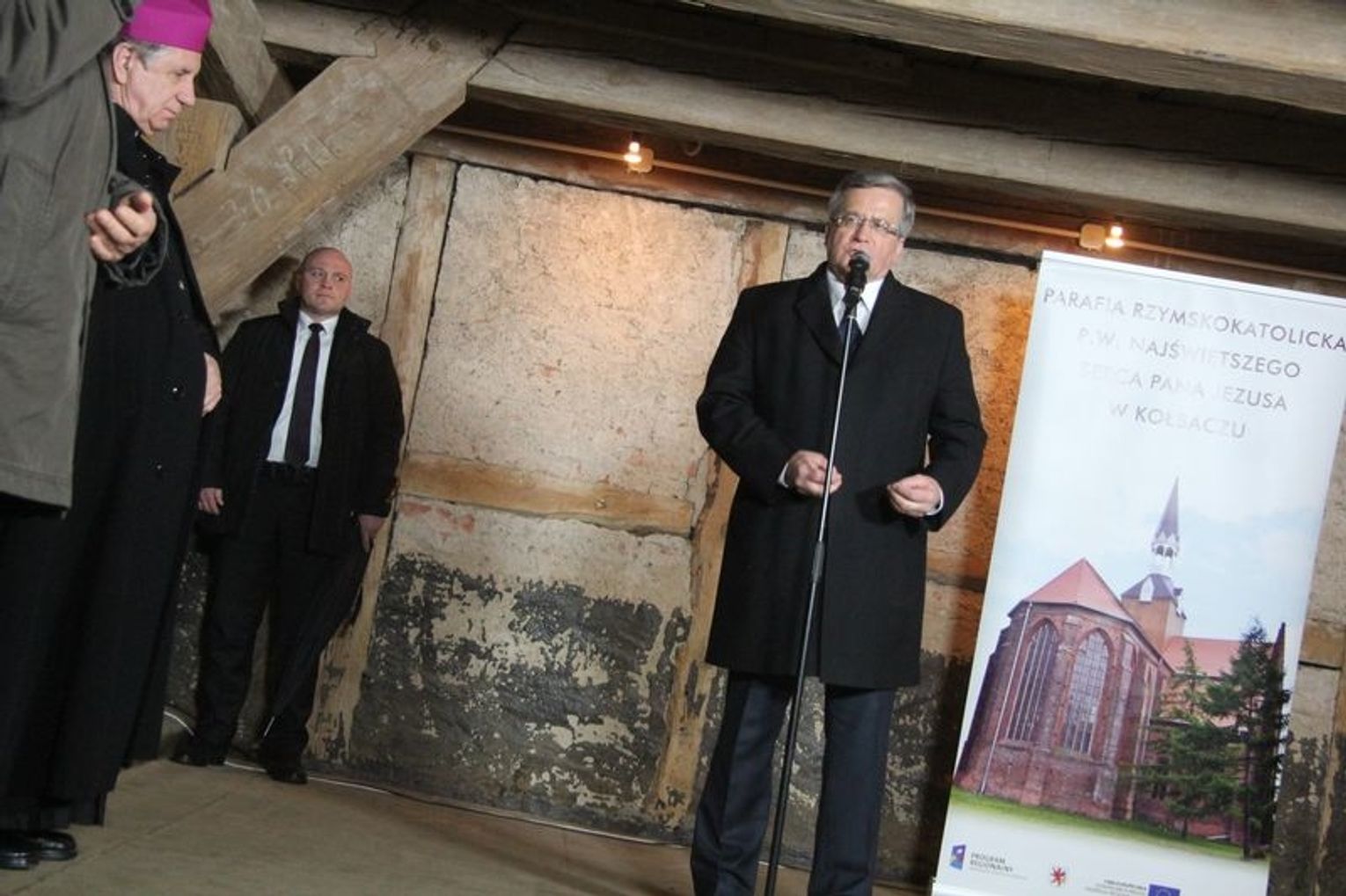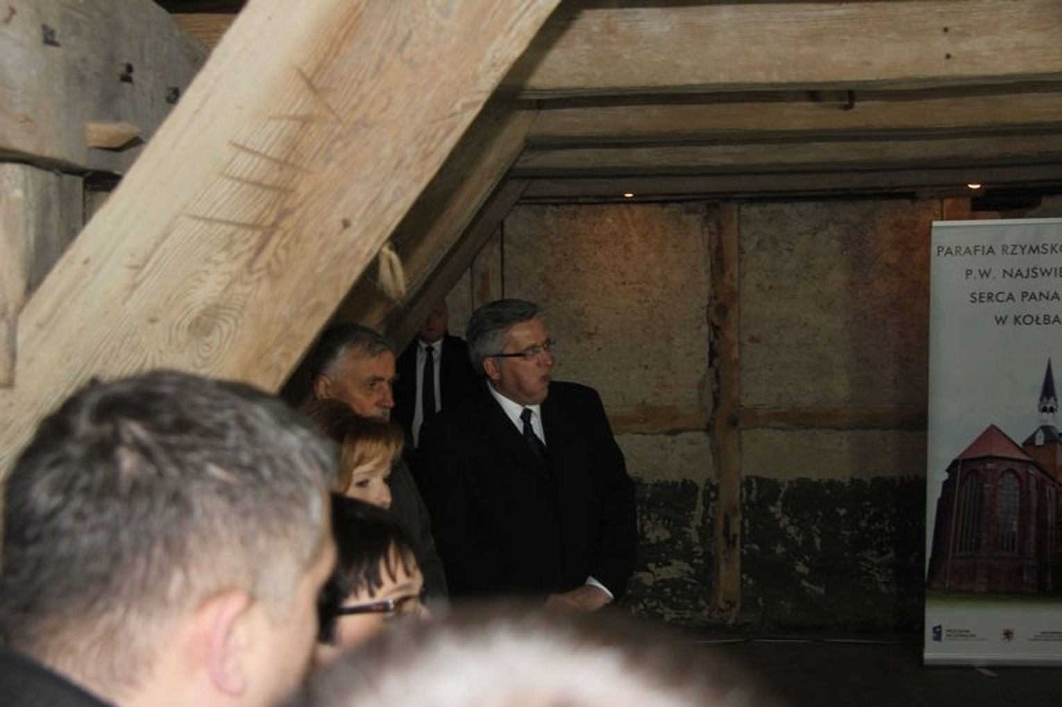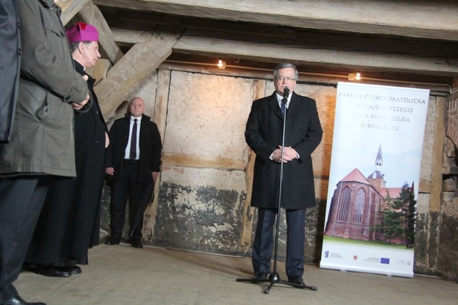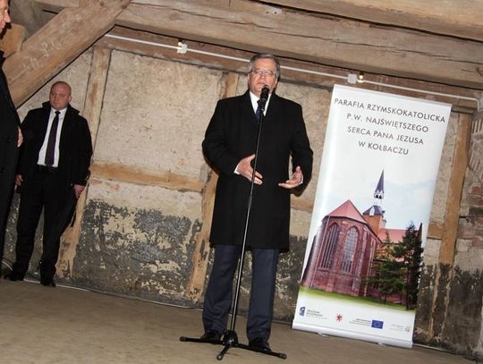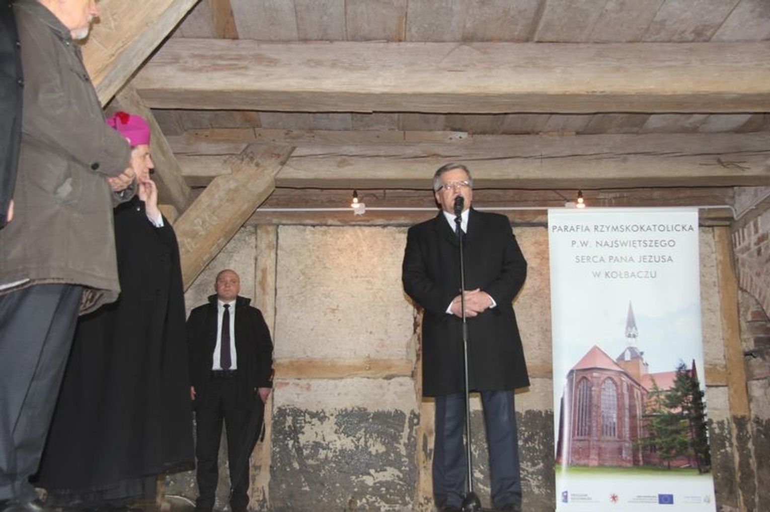 Najpierw prezydent Bronisław Komorowski pojawił się w galerii cysterskiej, wchodząc na poddasze po stromych schodach. Wszedł, rozejrzał się i widać było, że spodobało mu się skromne, historyczne wnętrze. Po tym jak pochwalił się wiedzą o cystersach, wezwał mieszkańców do starania się o odnowienie perełki architektonicznej i czerpania z tego wszelakich zysków. Restaurację pomnika historii - Kołbacza porównał do innego pomnika – Łowicza. Arcybiskup Andrzej Dzięga zażartował, że oba miejsca mają tyle samo liter w nazwie, jednak Kołbacz jest wcześniej w alfabecie…