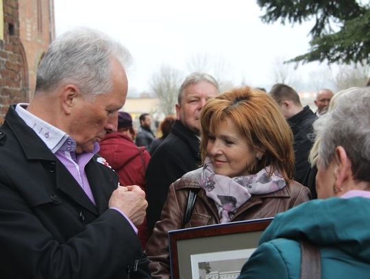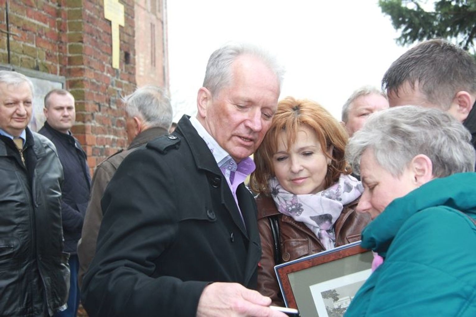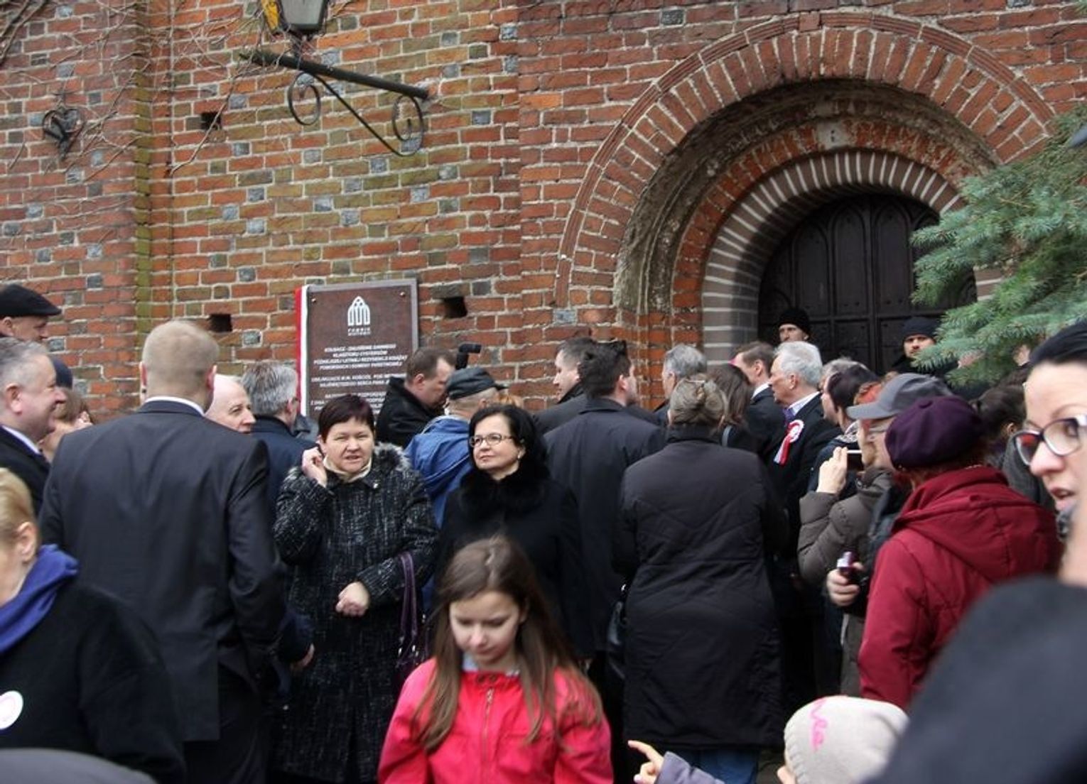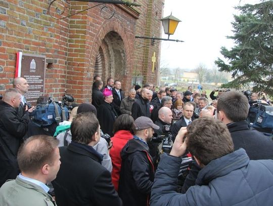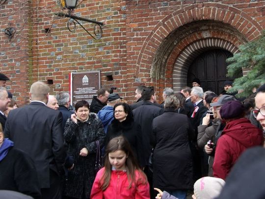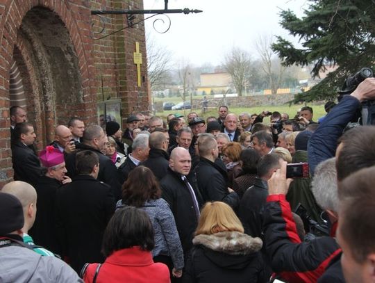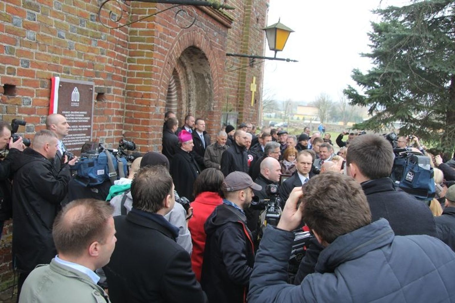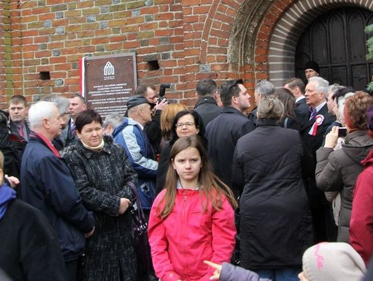 Prezydent przed kościołem szybko odsłonił stosowną tablicę (na zdjęciu), którą przytwierdzono po lewej stronie przy wejściu. Wyraźnie zaskoczonej i zadowolonej wójt Marzenie Grzywińskiej prezydent wręczył grafikę przedstawiającą swoją warszawską siedzibę.