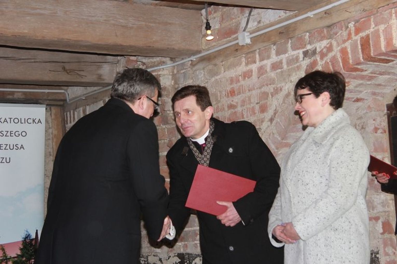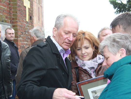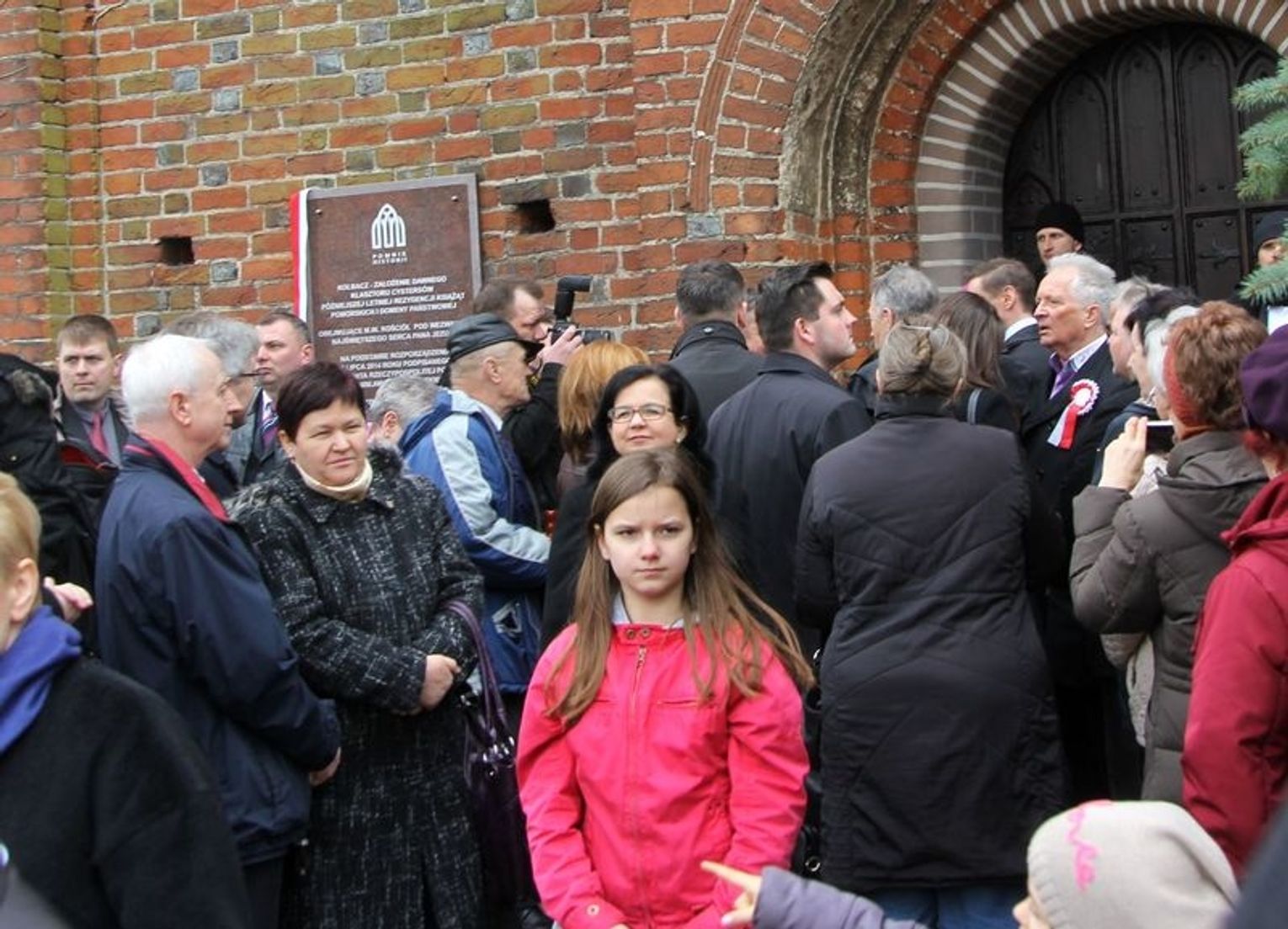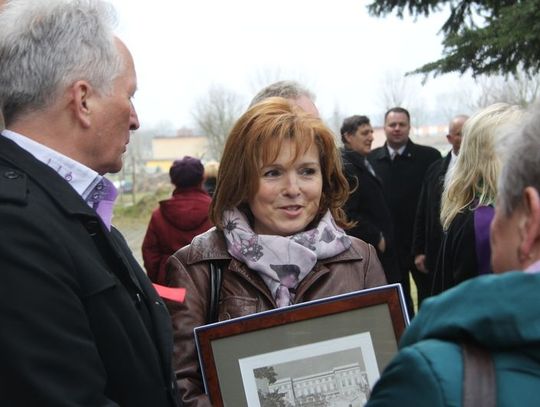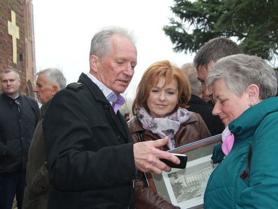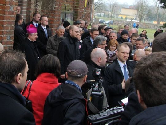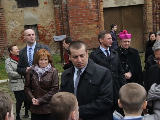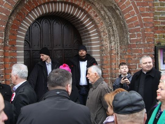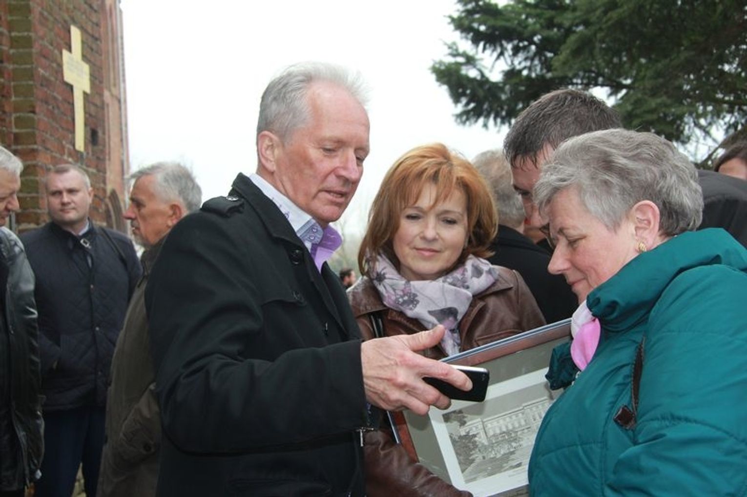 Prezydent przed kościołem szybko odsłonił stosowną tablicę (na zdjęciu), którą przytwierdzono po lewej stronie przy wejściu. Wyraźnie zaskoczonej i zadowolonej wójt Marzenie Grzywińskiej prezydent wręczył grafikę przedstawiającą swoją warszawską siedzibę.