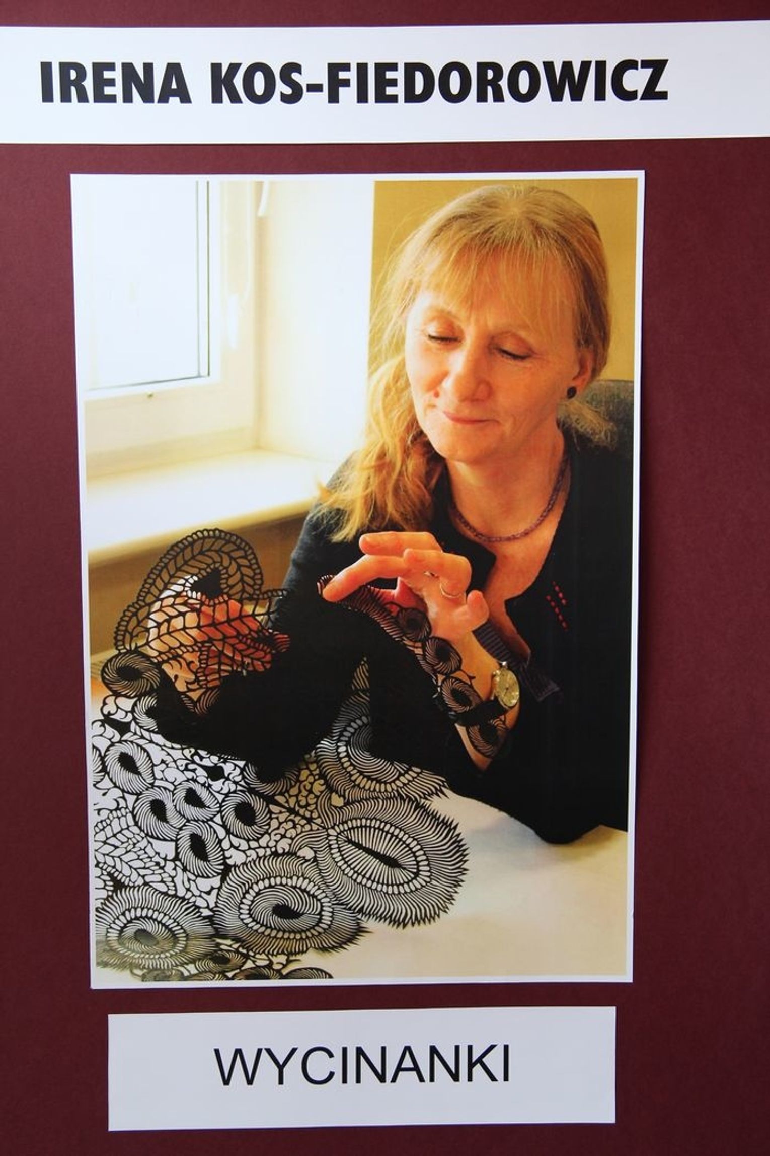 Autorką tych „niezliczonych ilości obrazów” jest Irena Kos-Fiedorowicz, która będąc rozmiłowaną w sztuce wycinanki, tnie nożyczkami i nożykiem misterne niczym koronki dzieła o „kruchych i finezyjnych liniach”. Prace, które można obejrzeć na wystawie, są bliskie wschodniemu teatrowi cieni i grafice.