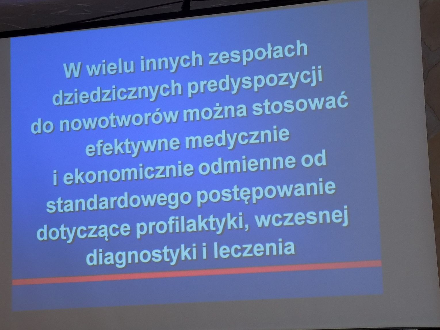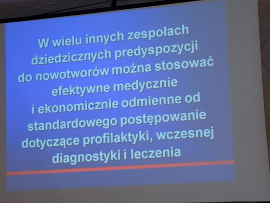 W dalszej części wykładu ilustrowanego wykresami profesor Jan Lubiński mówił o mutacjach genetycznych, nad którymi prowadzi badania i o sukcesach osiągniętych w tej dziedzinie. Bardzo ważną rzeczą, na którą zwracał szczególną uwagę, jest profilaktyka. Słowo „nowotwór” budzi przerażenie i przyjmowane jest jako wyrok. Wielu ludzi nie poddaje się badaniom z obawy usłyszenia: ma pani raka. Nie wolno bać się badań profilaktycznych! Wcześnie wykryty nowotwór daje szanse na wyleczenie, na przeżycie. Wczesna diagnostyka jest konieczna i im wcześniej to zrozumiemy, tym lepiej dla nas.