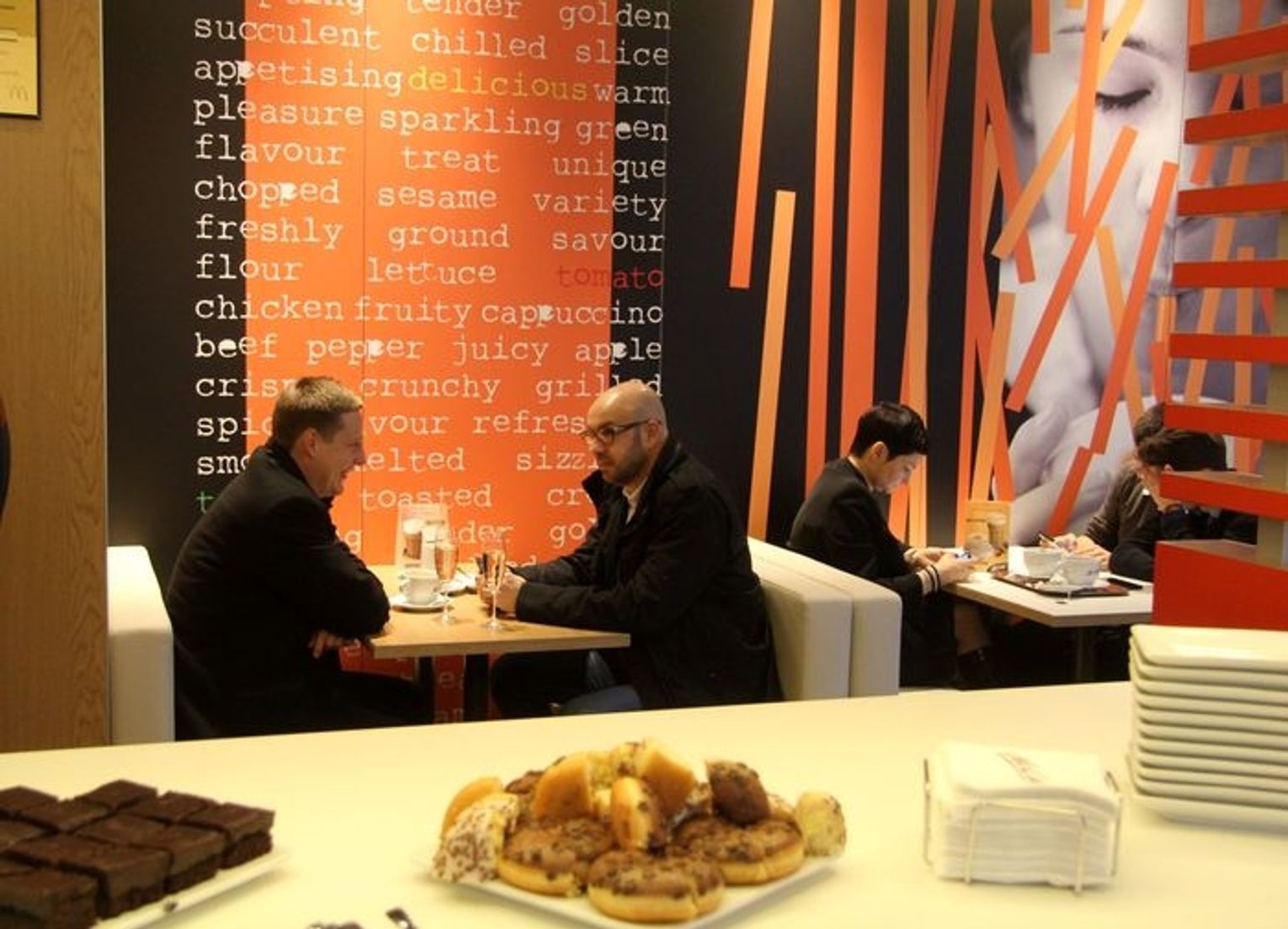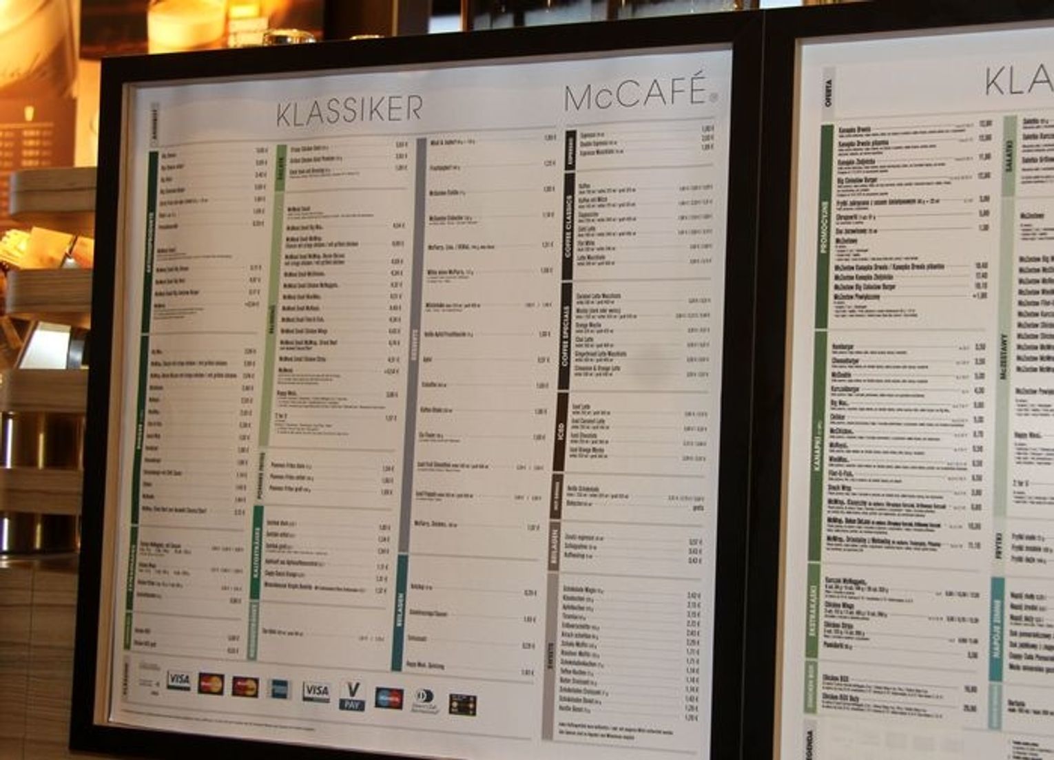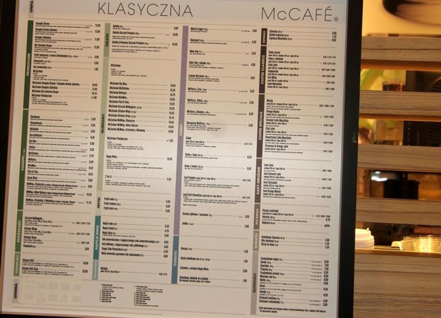 W godzinach porannych w restauracji dostępne są produkty z oferty śniadaniowej bazujące na jajkach, produktach zbożowych i bekonie. W pozostałych godzinach obowiązuje dobrze znana oferta klasyczna. Goście mogą raczyć się specjałami z kącika kawiarnianego McCafé, w ofercie którego znajdują się najwyższej jakości kawy oraz szeroki wybór deserów.
