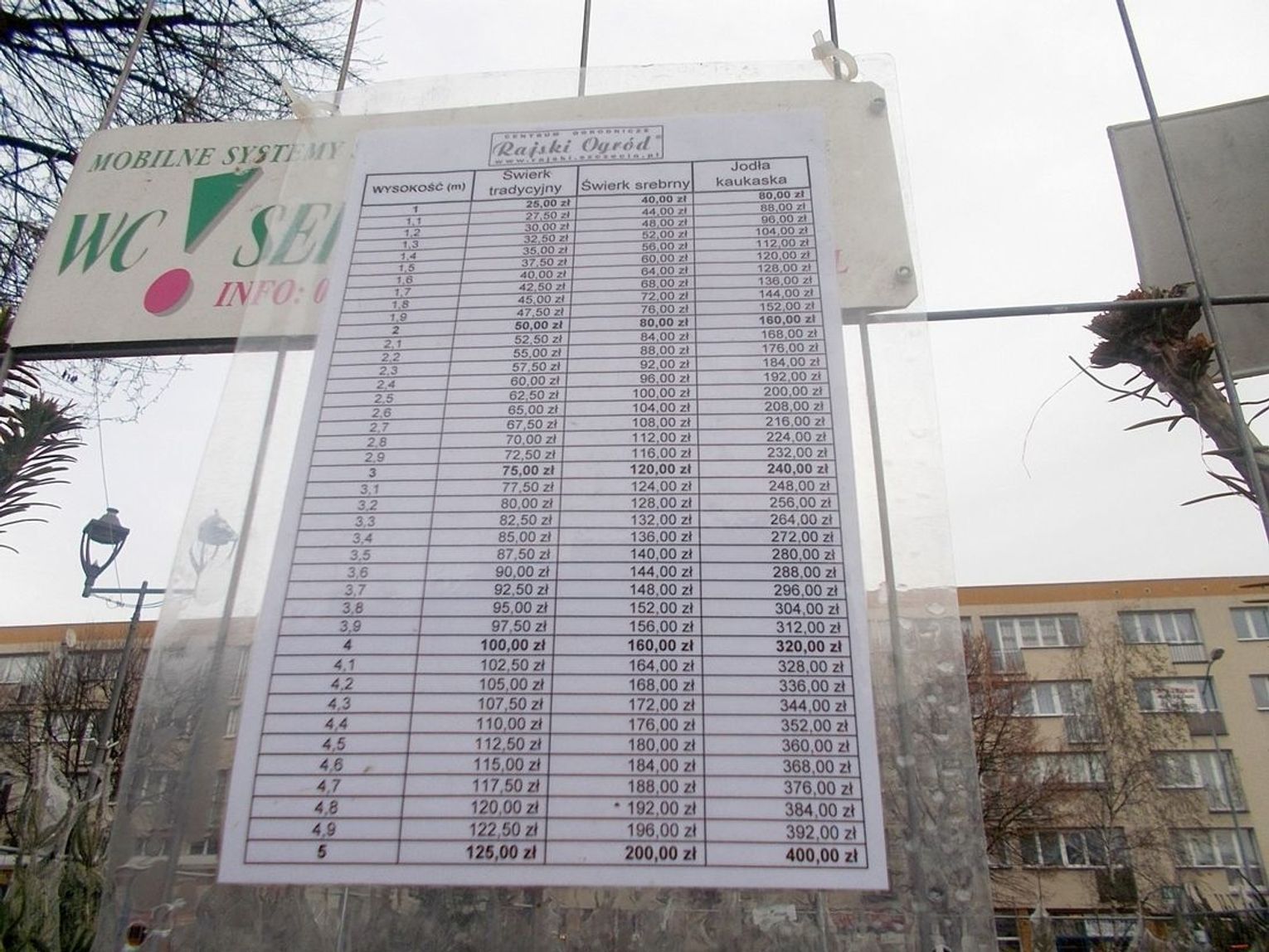 Doniczkowe drzewka są trochę droższe. Ceny w zależności od „wzrostu”. Im wyższa choinka, tym droższa. Ceny dotyczą mb. Już za 37 zł można kupić świerk srebrny w doniczce, a jodłę kaukaską po 57 lub 79 złotych. Cięte drzewka są już za 40 – 80 zł. Ceny różne i na każdą kieszeń.
