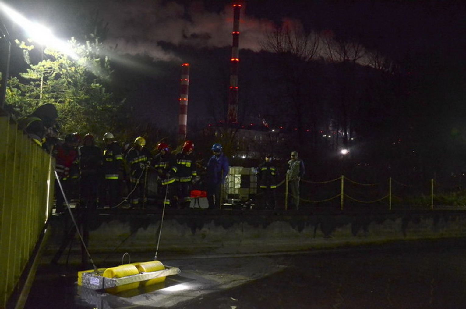 W scenariuszu ćwiczeń założono także przedostanie się mazutu z wanny wychwytującej do instalacji burzowej i dalej na oczyszczalnię, gdzie mazut gromadził się w betonowym otwartym zbiorniku odkładczym. Pracownicy Elektrowni wspólnie z ratownikami zatrzymali wyciek, a następnie strażacy przy użyciu skimera zebrali mazut z powierzchni zbiornika.