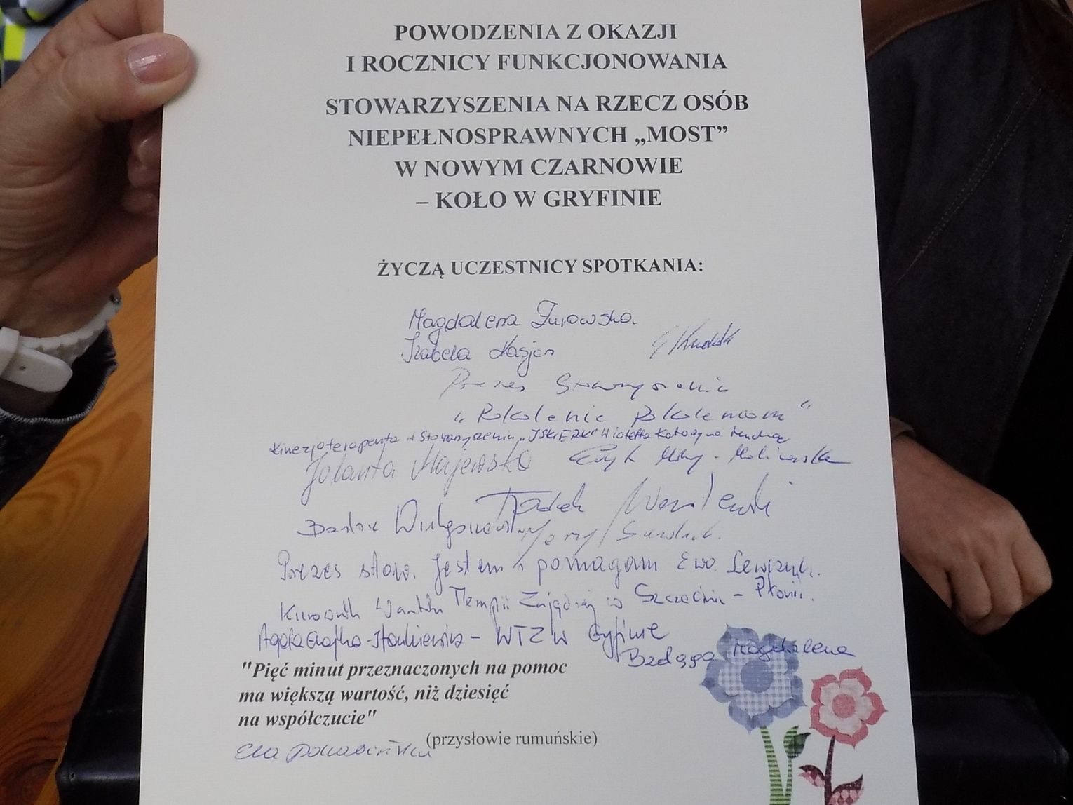 Pomysł się udał. Były tańce prowadzone przez Kasię Pawlak. Przybył Tadek Wasilewski z pensjonariuszami z Dziennego Domu Senior-Wigor. Przyjechali strażacy z Komendy Powiatowej Państwowej Straży Pożarnej. Życzenia składali m.in. goście ze Starostwa Powiatowego oraz Urzędu Miasta i Gminy w Gryfinie, a także przedstawiciele innych stowarzyszeń. Przygotowano nawet kolorowy tort i prezenty.
