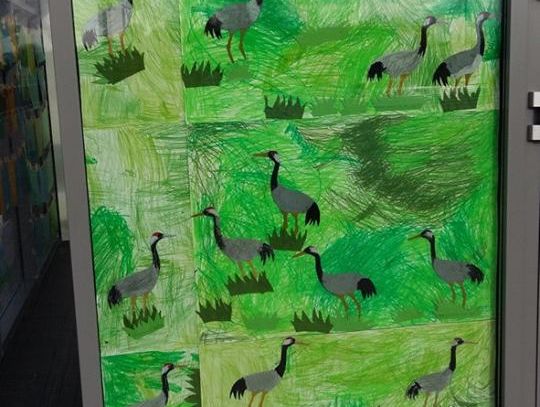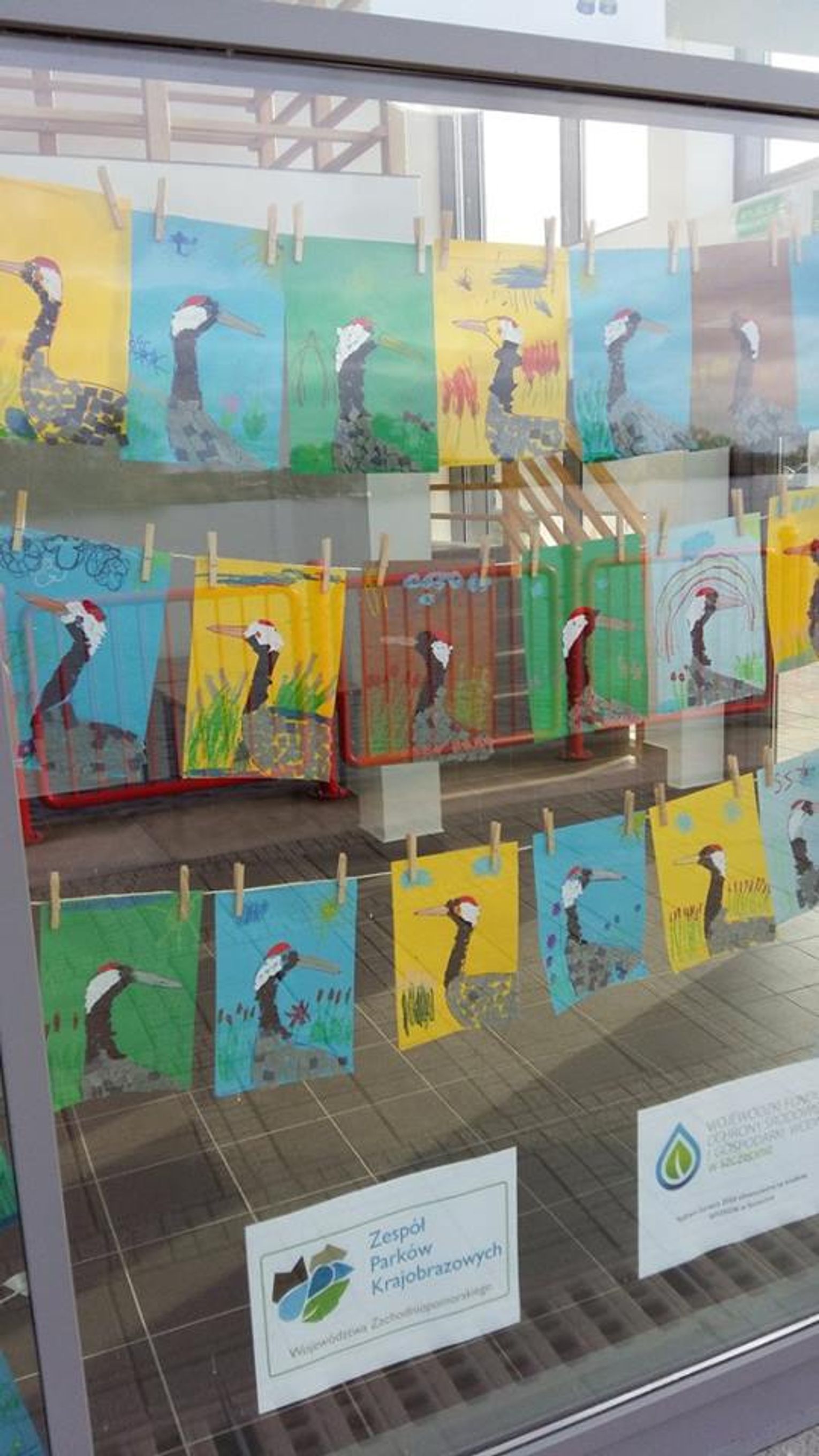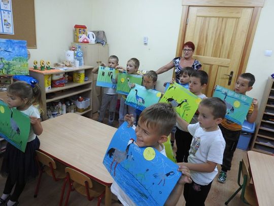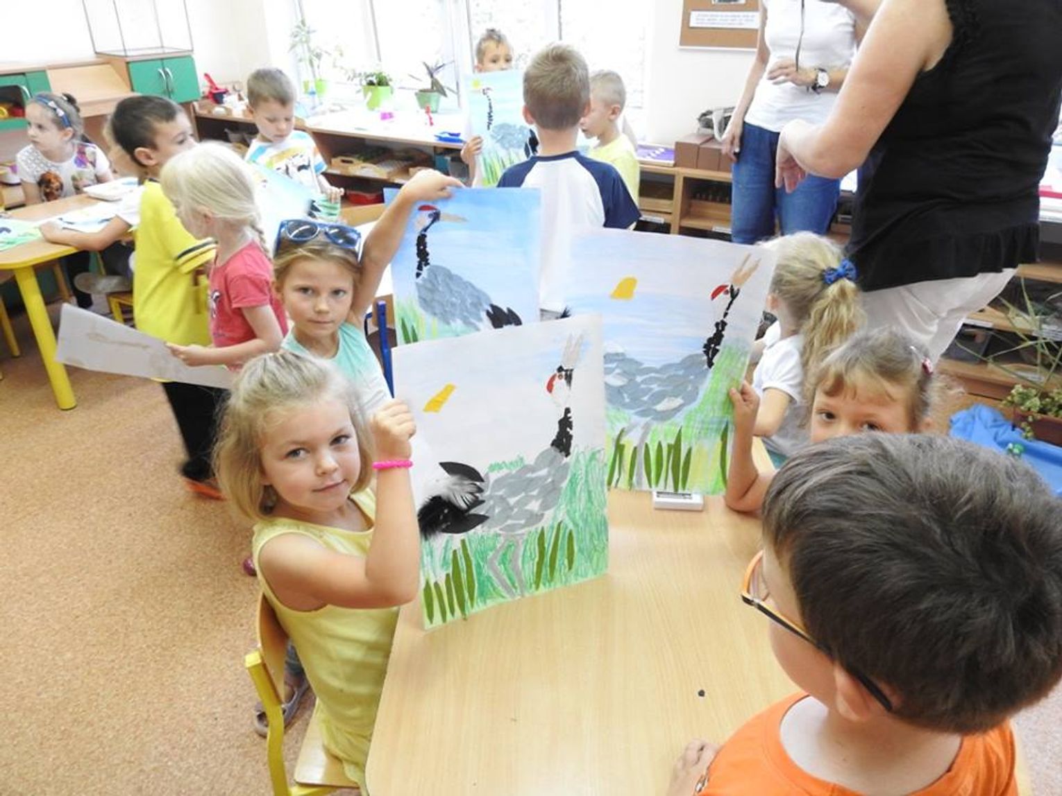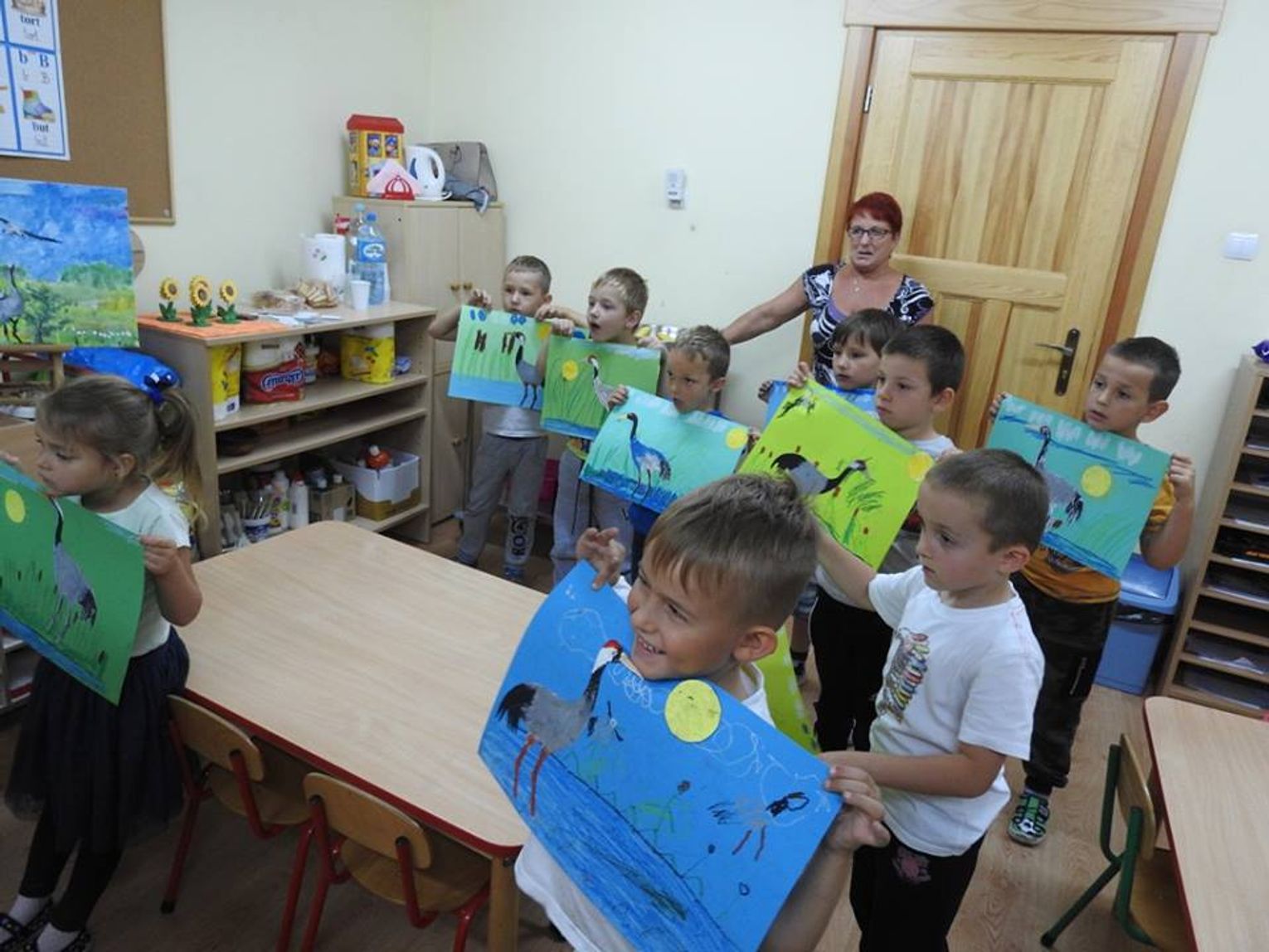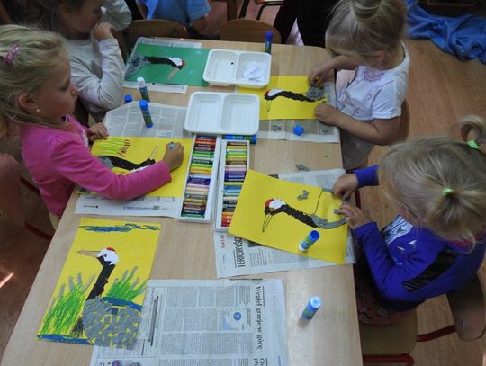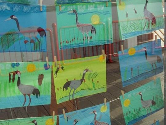 Otóż w każdy poniedziałek (od 12 września do 10 października) parkowy edukator wprowadzał dzieci w tajniki biologii żurawia, opowiadając o miejscach jego bytowania, o ornitologicznym fenomenie jesiennych migracji na terenie Parku Krajobrazowego Dolina Dolnej Odry. Dzieci mogły poznać kolory ubarwienia żurawia, dowiedzieć się co żurawie lubią jeść oraz usłyszeć żurawi klangor. Po zdobyciu tylu nowych informacji, dzieci pod okiem nauczyciela plastyki własnoręcznie przygotowywały prace plastyczne, których tematem przewodnim był żuraw. Każda z grup przygotowywała prace przy użyciu różnych technik. Powstały liczne sylwetki żurawia, żurawie w trzcinach, klucze żurawi w locie.