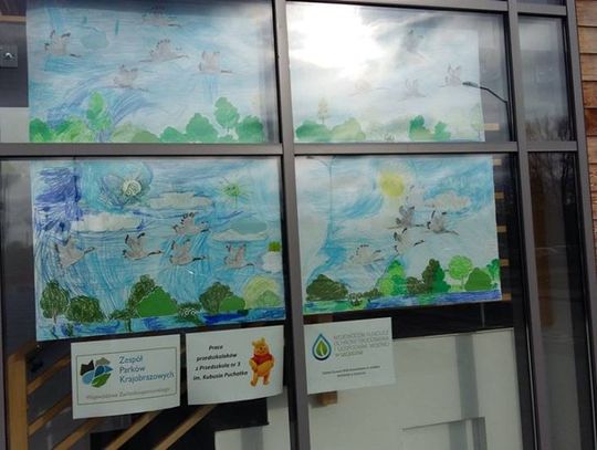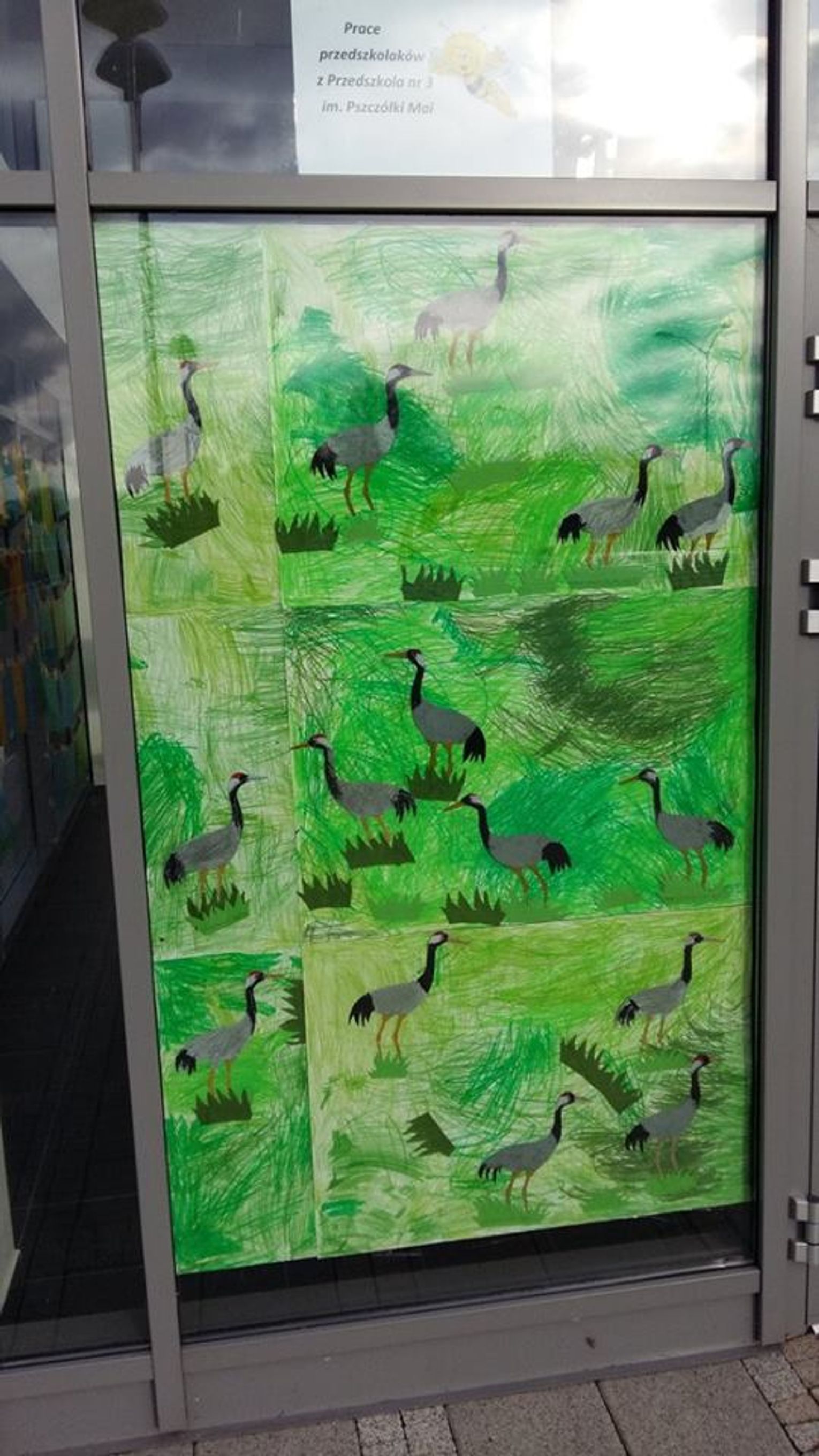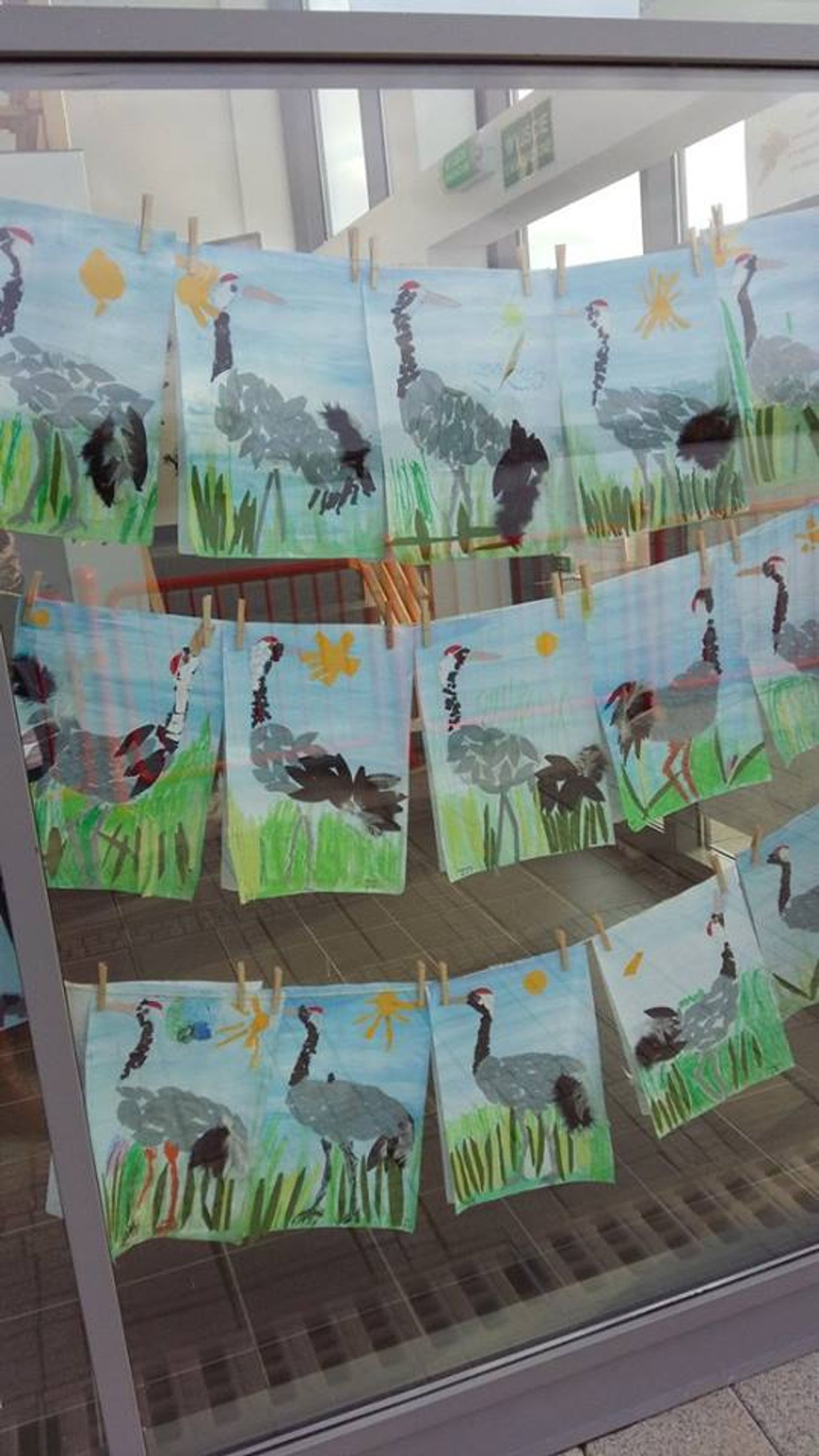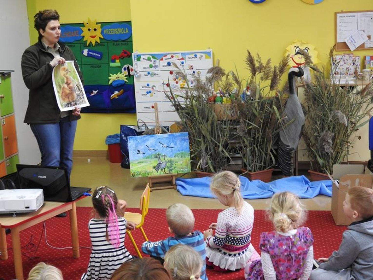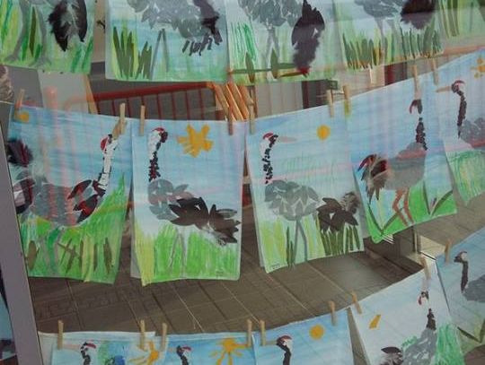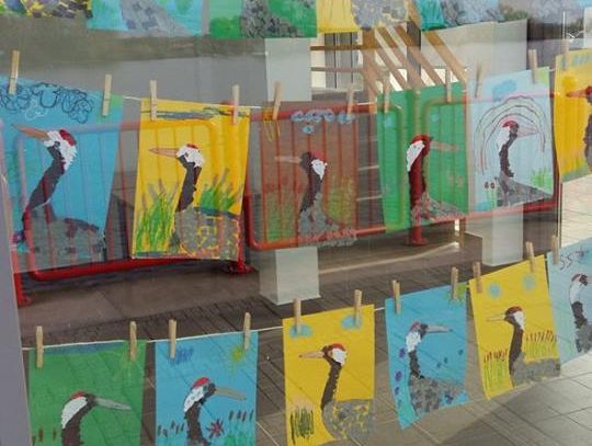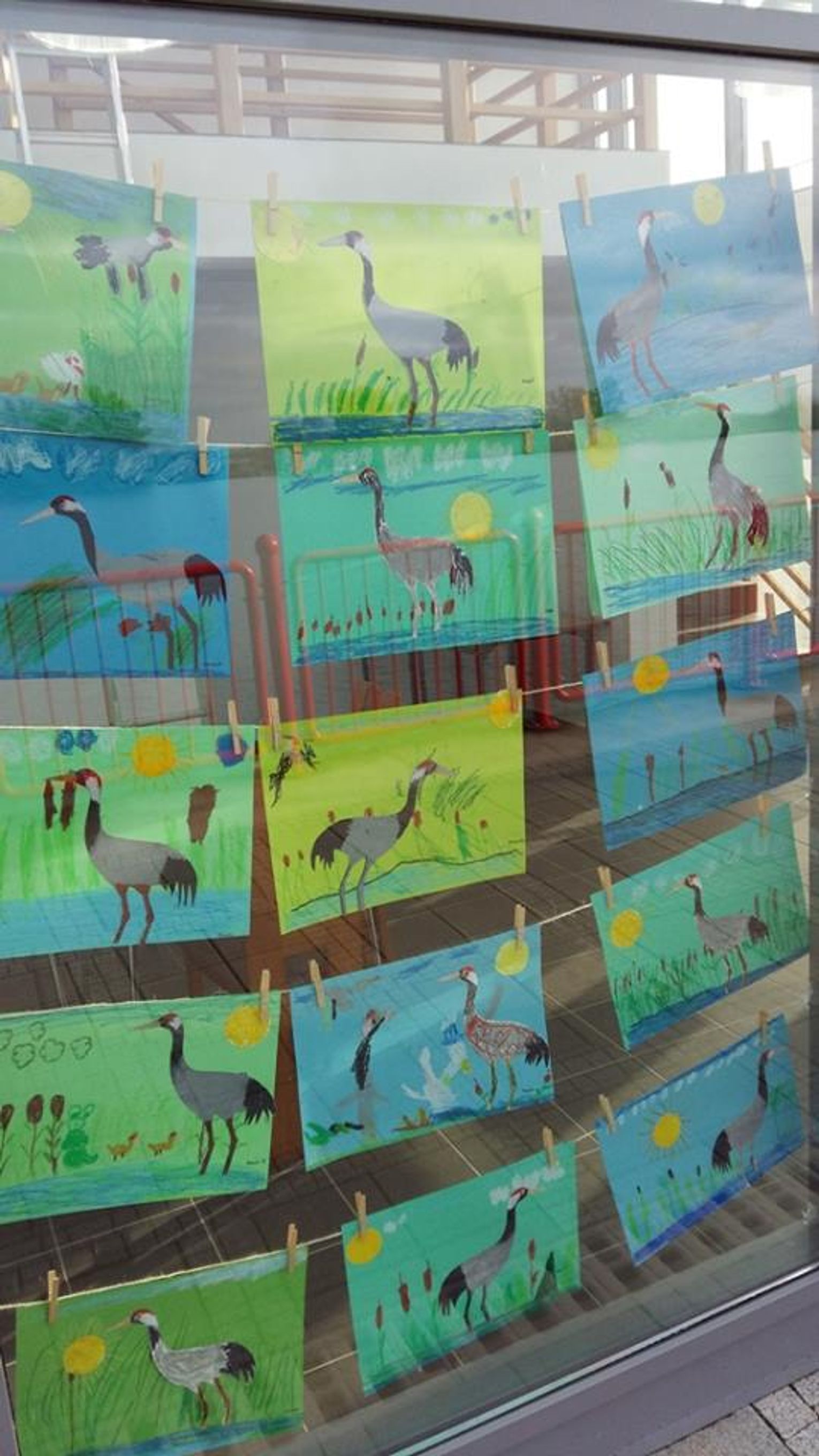 Otóż w każdy poniedziałek (od 12 września do 10 października) parkowy edukator wprowadzał dzieci w tajniki biologii żurawia, opowiadając o miejscach jego bytowania, o ornitologicznym fenomenie jesiennych migracji na terenie Parku Krajobrazowego Dolina Dolnej Odry. Dzieci mogły poznać kolory ubarwienia żurawia, dowiedzieć się co żurawie lubią jeść oraz usłyszeć żurawi klangor. Po zdobyciu tylu nowych informacji, dzieci pod okiem nauczyciela plastyki własnoręcznie przygotowywały prace plastyczne, których tematem przewodnim był żuraw. Każda z grup przygotowywała prace przy użyciu różnych technik. Powstały liczne sylwetki żurawia, żurawie w trzcinach, klucze żurawi w locie.